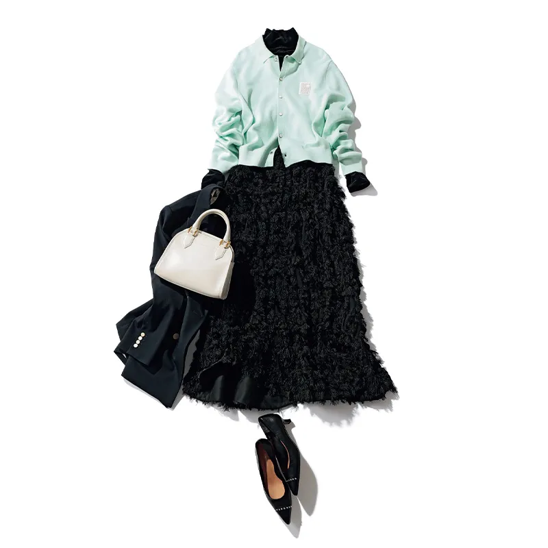 トップス¥9,900(セルフォード/セルフォード ルミネ新宿2店)カーディガン¥44,000(キャバン/キャバン 丸の内店)スカート¥52,800(ランバン オン ブルー)ジャケット¥44,000(アンクレイヴ/オンワード樫山 お客様相談室)バッグ¥209,000(J&M デヴィッドソン/J&M デヴィッドソン カスタマーセンター)パンプス¥23,980(J&M デヴィッドソン/モーダ・クレア)
