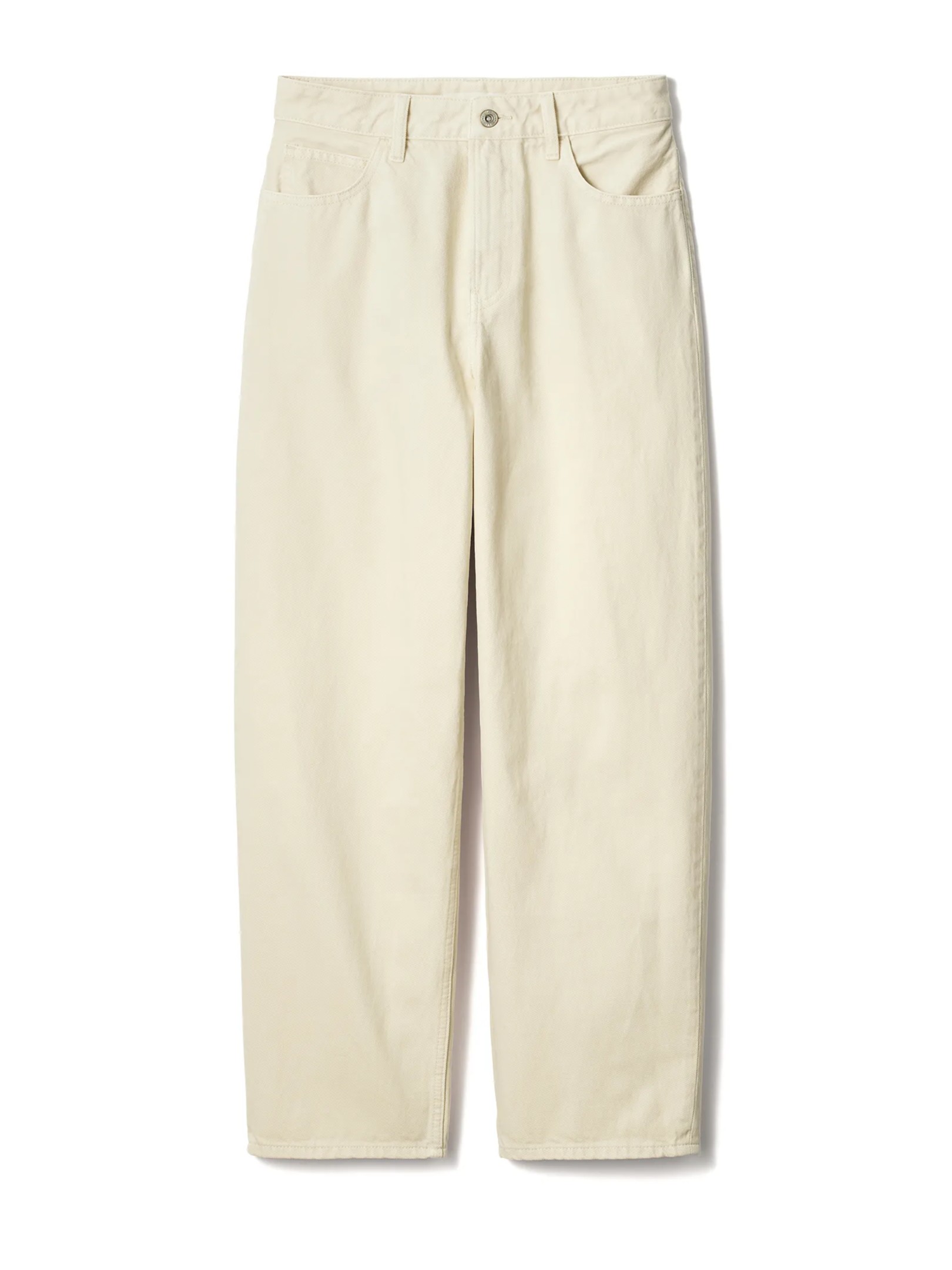 こちらもコットン100%素材を使用。腰まわりはほどよくフィットしつつ、太ももから裾にかけてカーブを描くテーパードシルエットが特徴です。生成りのようなアイボリーは、ほんのりくすんだ絶妙カラーでこなれ感抜群。真っ白よりも気負わず着られるのもうれしいポイントです。