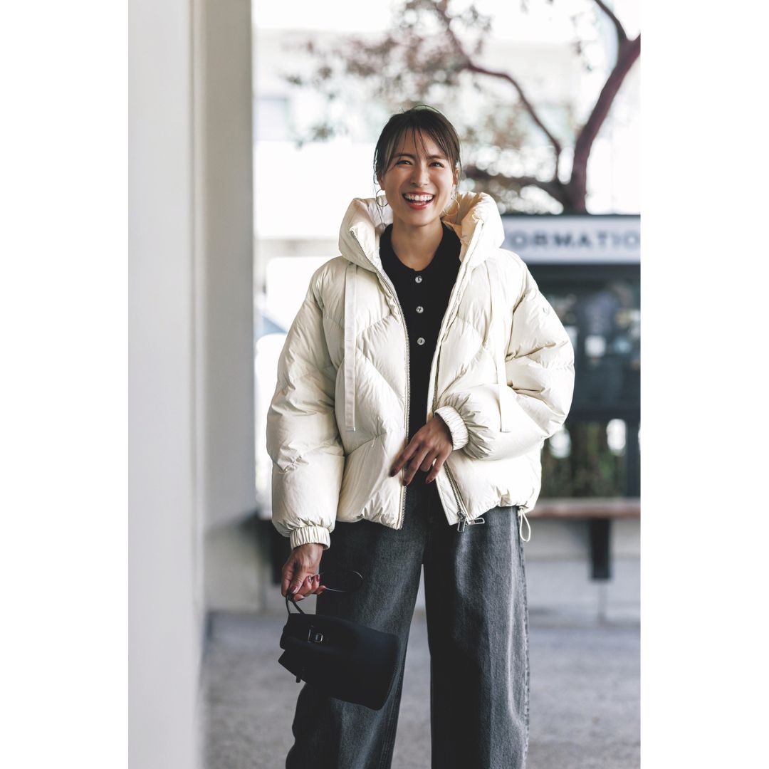 ダウンジャケット[PEGGIE]¥97,900〈デュノ〉ポロニット¥38,500〈フィリッポデ ローレンティス〉デニムパンツ¥60,500〈クローズド〉(すべてトヨダトレーディング プレスルーム)ピアス¥3,780(アビステ)バッグ/ スタイリスト私物