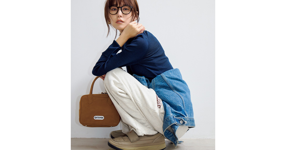 シューズ¥20,900(ザ・ノースフェイス/ゴールドウイン カスタマーサービスセンター) Gジャン¥41,800(ザ シンゾーン/シンゾーン 表参道本店) ニットタートル¥35,200(カオス/カオス表参道) スウェットパンツ¥14,300(スピック&スパン/スピック&スパン ルミネ有楽町店) ピアス¥9,130(ラブ・エージェイ/ズットホリック) メガネ¥54,780(オリバーピープルズ/ルックスオティカジャパン カスタマーサービス) バッグ¥14,300(アウトドアプロダクツ/アウトドアプロダクツ 中目黒店)