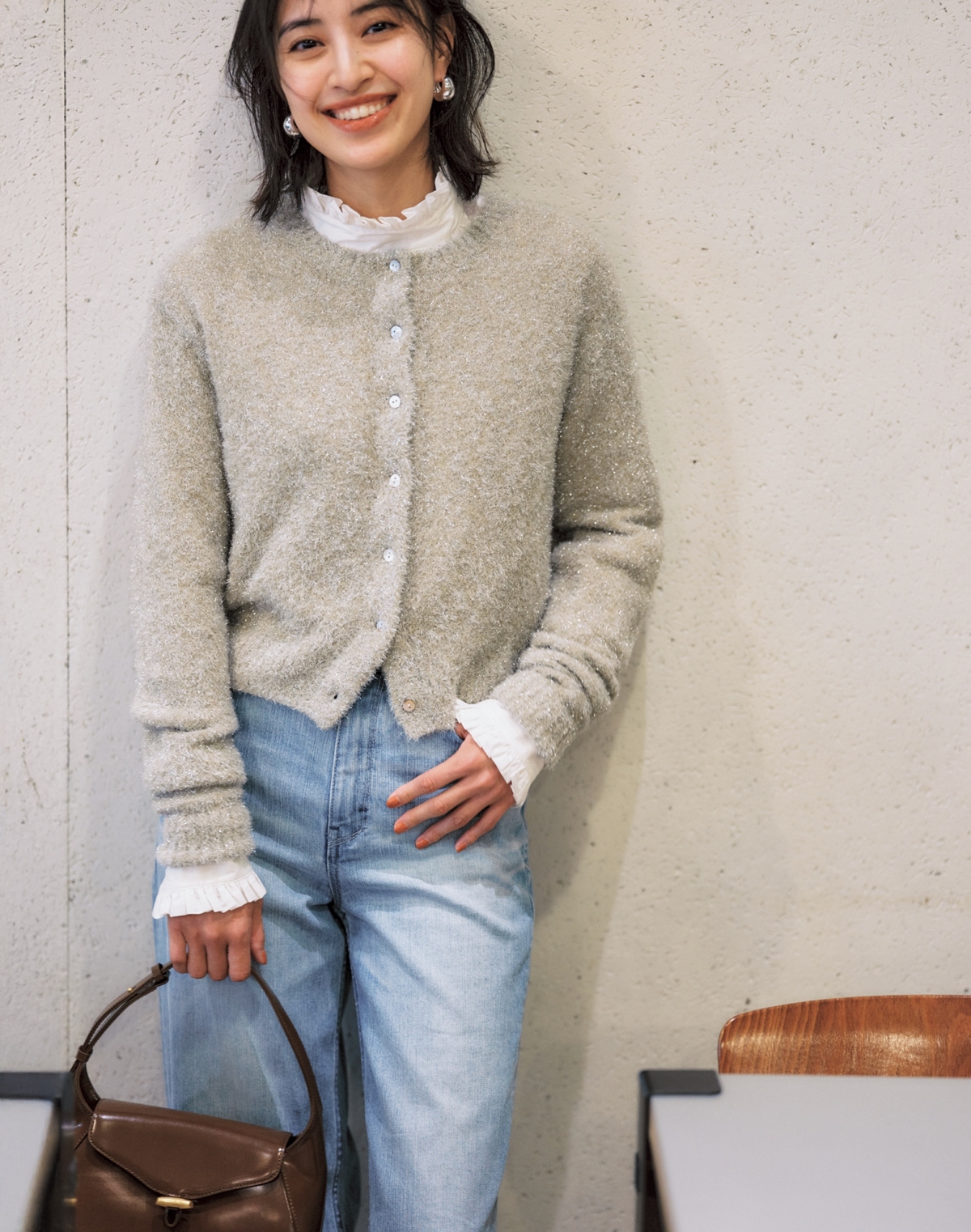 寒さを凌ぐラメカーディガンに、春の定番“白ブラウス×ブルーデニム”の組み合わせを仕込んだコーデ。首元と袖口からクリーンな白が覗くだけで、顔周りも華やかに。きちんと感と動きやすさを両立できるから、習い事や子連れのお出かけにぴったりです。デニムパンツはヤヌーク、カーディガンはユニバーサル オーバーオール、ブラウスはソブ、バッグはルメメのもの。