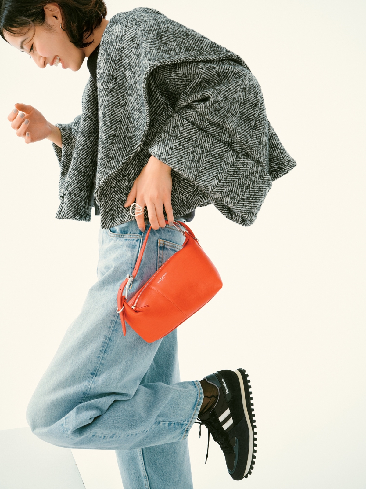 グレンチェックや細かいギンガムなど、モノトーンのウールコートはブルーデニムと相性抜群。デニムとスニーカーの間からシアー靴下を覗かせたり、明るい色のバッグを添えるだけで、暖かさはそのままに一足先に春の気配を。お迎えや公園など、いつものシーンも小物の一工夫で鮮度がアップ! デニムパンツはガニー、コートはシーニュ、ニットはノーク、バッグはJ&M デヴィッドソン、スニーカーはゼットディーエー、靴下はタビオのもの。
