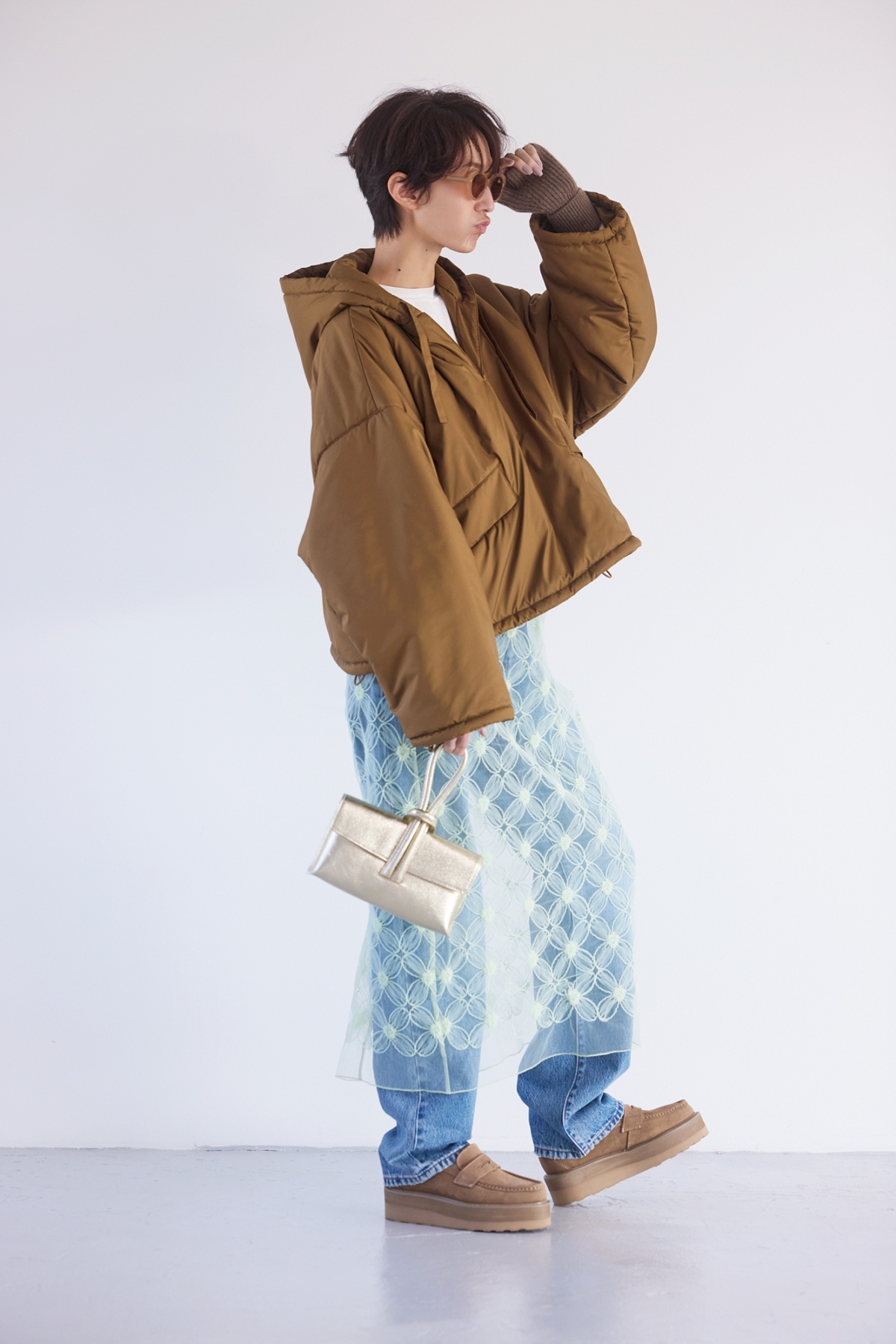 中綿アウターやもこもこブーツを思わず手に取る防寒優先の日は、2月も終わるというのに真冬感が…。そんなときは、いつものデニムにシアーなレーススカートを重ねて、足元から軽やかさを取り入れて。カジュアルさも薄まって、今っぽくドレスアップ! デニムパンツはリーバイス、レーススカートはエミ、パフプルオーバーはザハイライツ、カットソーはアンフィーロ、靴はカミナンド、バッグはリンレザーのもの。