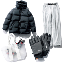 ダウンジャケット¥82,500〈ケープホーン〉パンツ¥45,540〈テラ〉バッグ¥44,000〈ヴィアメイルバッグ〉(すべてティースクエア プレスルーム) ピアス¥22,000(ワンエーアールバイウノアエレ/ ウノアエレ ジャパン)