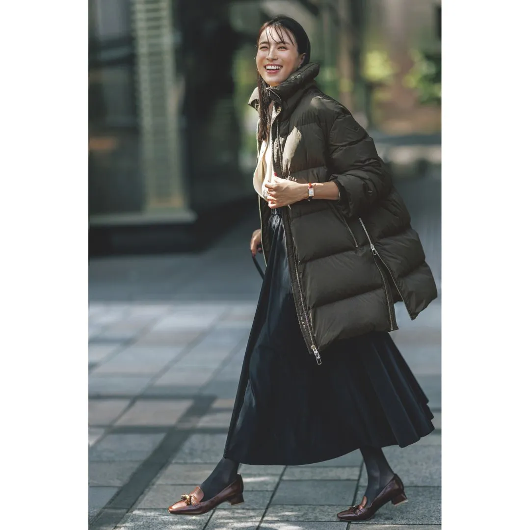ダウンジャケット[SHIVA]¥104,500〈デュノ〉シャツ¥36,300〈チルコロ〉ニット¥60,500〈フィリッポ デローレンティス〉スカート¥60,500〈アスペジ〉(すべてトヨダトレーディング プレスルーム) ピアス¥9,350(ソーク/アンソロジー)時計¥20,900(マトウ/エイチエムエスウォッチストア 表参道) バッグ¥11,000(アルテミス by ダイアナ/アルテミス by ダイアナ アーバンドック ららぽーと豊洲店)タイツ/スタイリスト私物