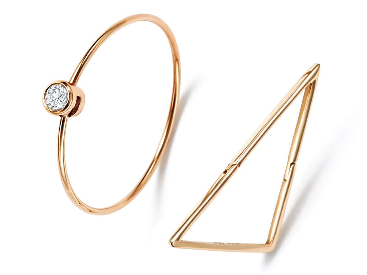 シングルフープピアス〈K18YG×DIA〉¥148,500シングル三角フープピアス〈K18YG〉¥55,000(ともにシハラ╱シハラ トウキョウ)