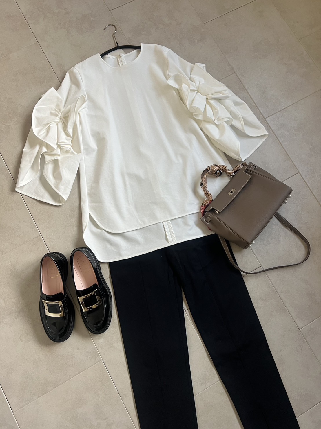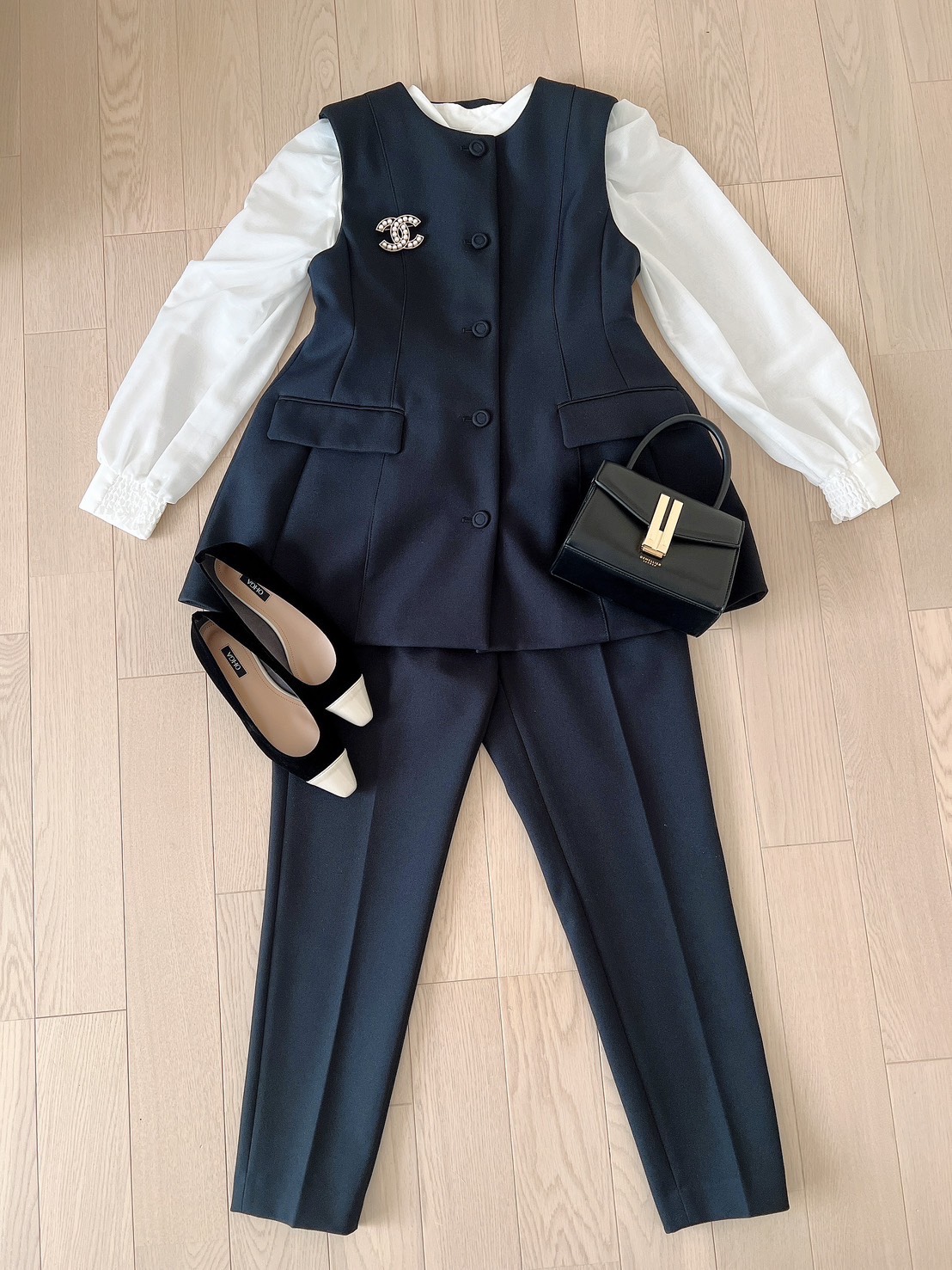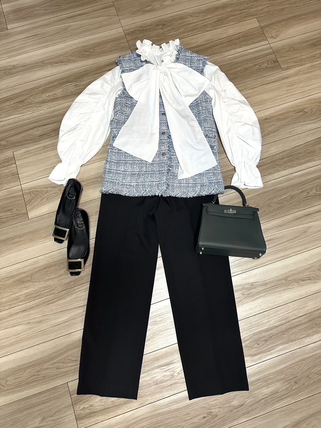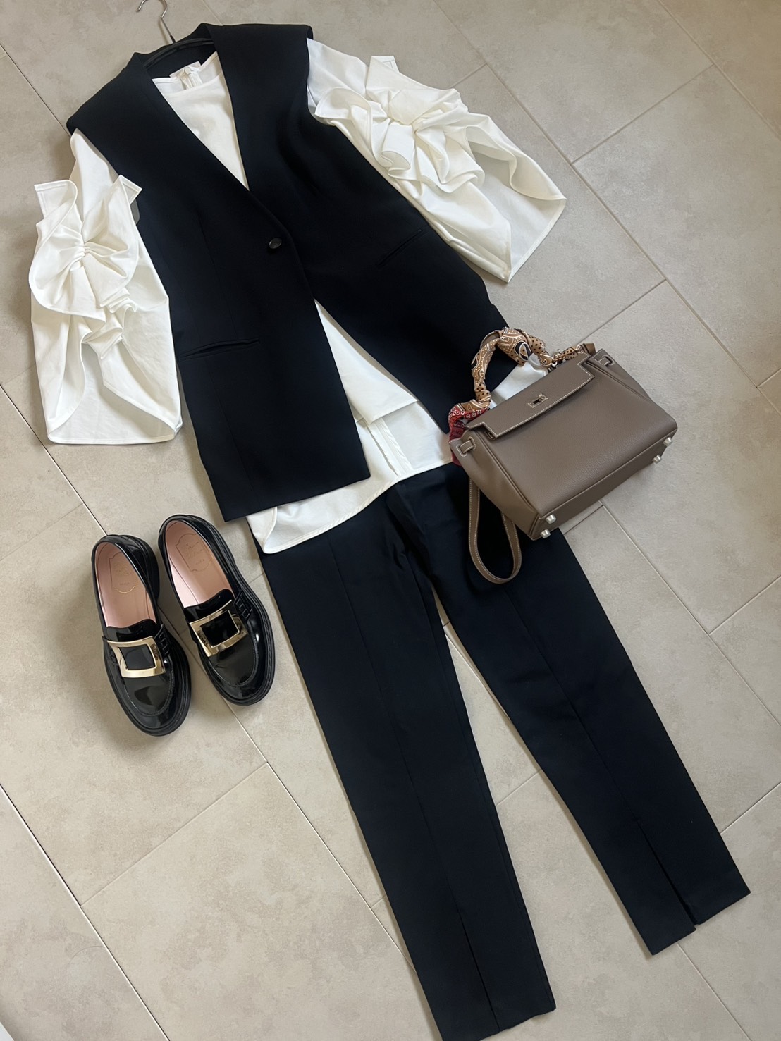 gilet/moi salon et ropé blouse/CADUNE pants/ESTNATION shoes/Roger Vivier bag/Hermès