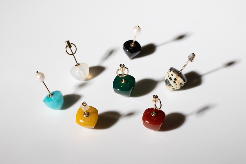 表情まで柔和に見せるパールの「パンクチャー」と、反対の耳には一転、シュガーローフカットが施された大粒のダルメシアンジャスパーを耳の後ろから覗かせた、モダンで辛口なスタイリング。キャラの違うアイテムどうしを自由に重ね、ハッとさせるような多面的な魅力を印象付けられるのもHirotakaならではの楽しさ。