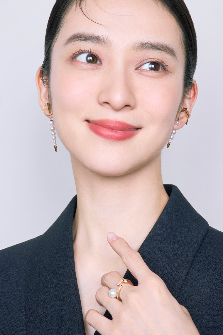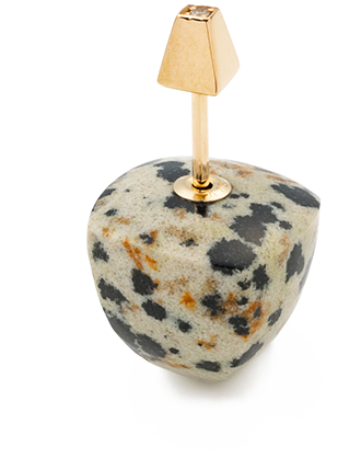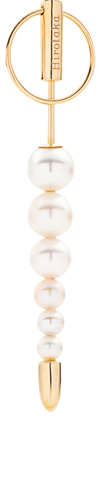 表情まで柔和に見せるパールの「パンクチャー」と、反対の耳には一転、シュガーローフカットが施された大粒のダルメシアンジャスパーを耳の後ろから覗かせた、モダンで辛口なスタイリング。キャラの違うアイテムどうしを自由に重ね、ハッとさせるような多面的な魅力を印象付けられるのもHirotakaならではの楽しさ。