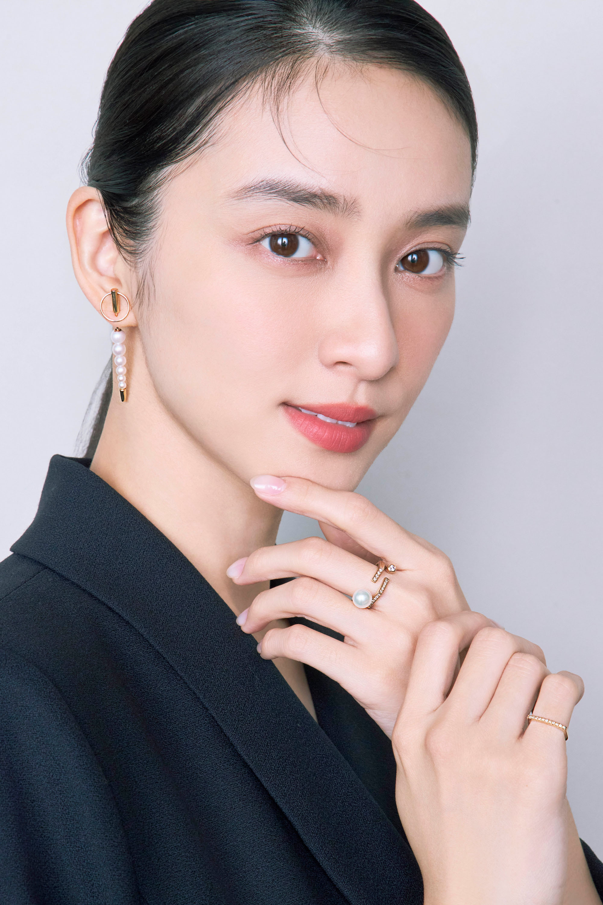 【右耳】ピアス「BIRD OF PARADISE マイクロスピア ピラミッド ピアス ダルメシアンジャスパー」<K10×ダイヤモンド×ダルメシアンジャスパー>¥81,400イヤーカフ上)「TREEHOPPER ダイヤモンド イヤーカフ S」<K10×ダイヤモンド>¥63,800イヤーカフ下)「TREEHOPPER ベゼル ダイヤモンド イヤーカフ M」<K10×ダイヤモンド>¥84,700【左耳】パールピアス「PUNCTURE バック スピア ドアノッカー アコヤパール ピアス M」<K10×アコヤパール>¥154,000【リング】右手人差し指)「EQUINOX-ピラミッド オニキスリング M」<シルバー×オニキス>¥59,400 左手薬指&中指)「BIRD OF PARADISE オニキス ダブルフィンガー リング」<K10×オニキス>¥79,200 左手中指&人差し指)「MIRÓ ダイヤモンド ダブル フィンガー リング ブラックルテニウム」<K10×ダイヤモンド>¥121,000(すべてHirotaka 表参道ヒルズ) トップス¥63,800(ハルノブムラタ/ザ・ウォール ショールーム)