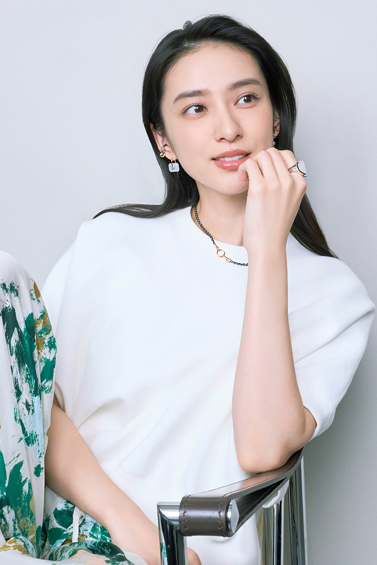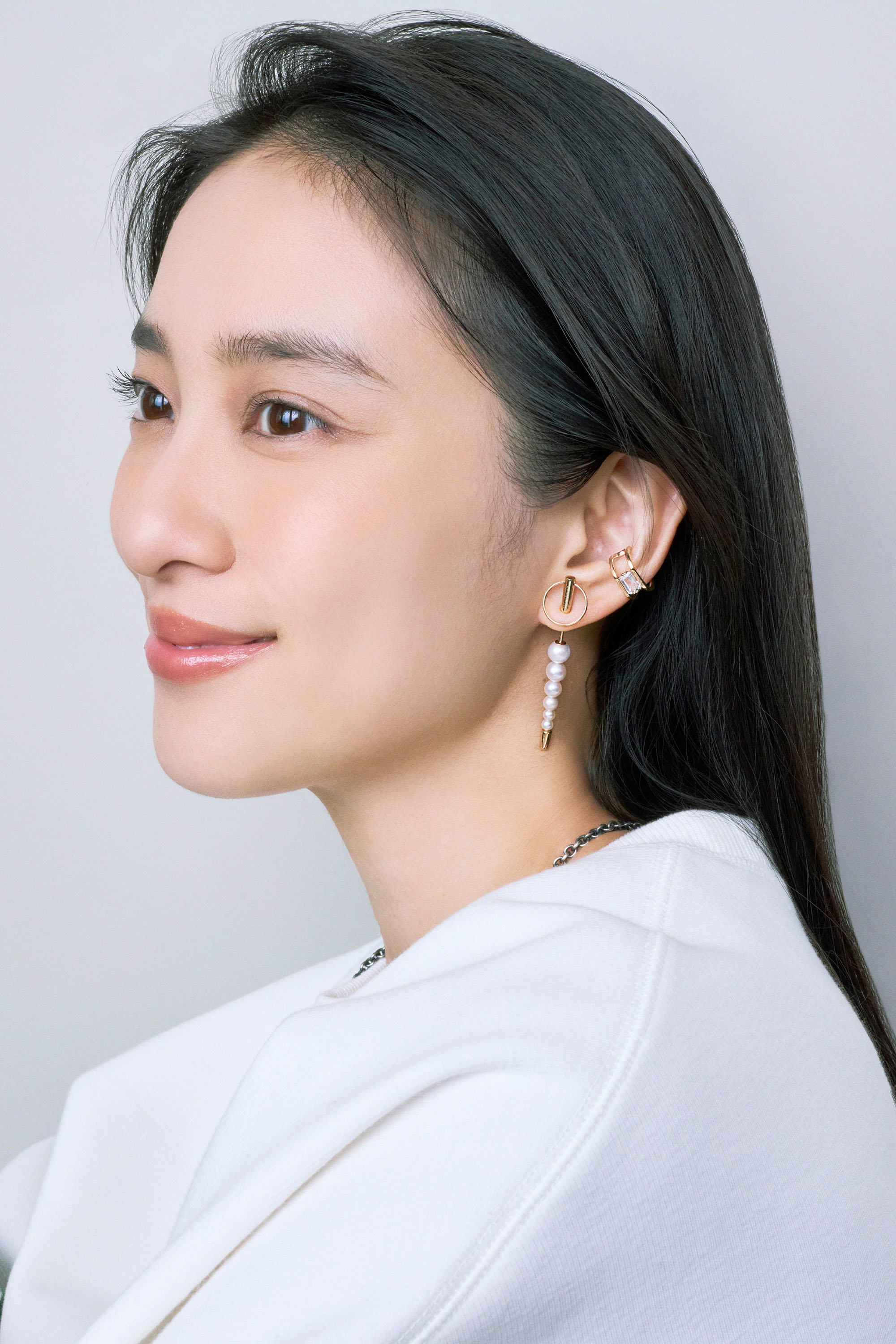 【右耳】ピアス「BIRD OF PARADISE ネイキッド ストーン フック ピアス」<K10×ホワイトカルセドニー>¥59,400イヤーカフ「DUNE イヤーカフ S」<シルバー×K10>¥66,000 【左耳】パールピアス「PUNCTURE バック スピア ドアノッカー アコヤパール ピアス M」<K10×アコヤパール>¥154,000イヤーカフ「BIRD OF PARADISE ホワイトトパーズ イヤーカフ」<K10×ホワイトトパーズ>¥85,800【ネックレス】「PIPISTRELLO ダブル リング チャーム チェーン ネックレス」<K18×シルバー(燻し加工)>¥201,300【リング】左手人差し指)「EQUINOX-ピラミッド ホワイトアゲート リング L」<シルバー×ホワイトアゲート>¥97,900(すべてHirotaka 表参道ヒルズ)トップス¥19,800パンツ¥39,600(ともにサクラ/インターリブ)