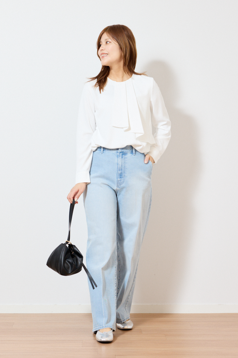 UVカットアシンメトリーフリルブラウス¥8,990ワイドストレートジーンズ¥13,000トライアングルミニバッグ¥7,990センターシームバレエシューズ¥5,990(すべてプラステ)その他ライター私物