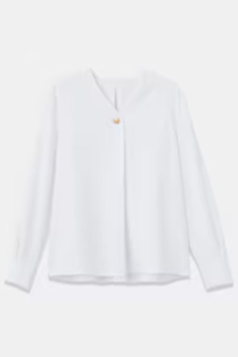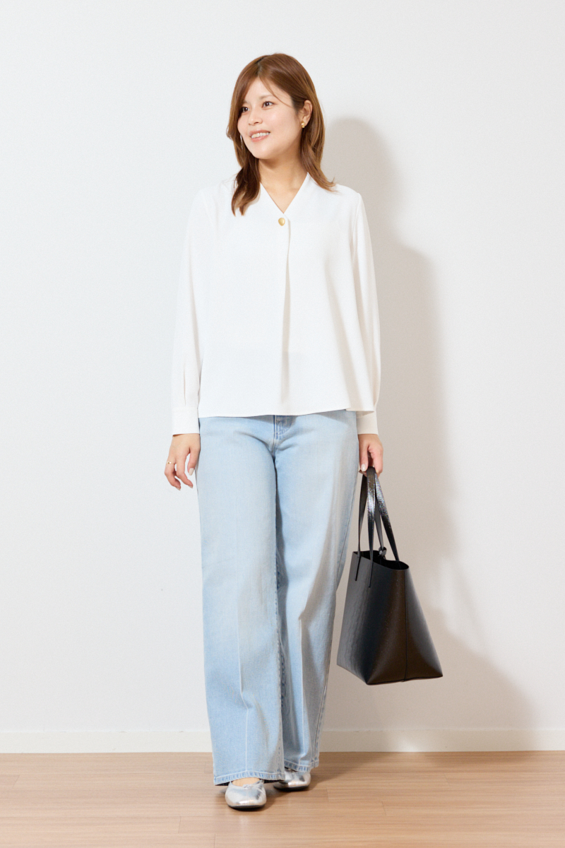 こちらもUVカット&速乾機能を備えた、扱いやすいイージーケアな生地。シャープな縦長のVネックが顔まわりをすっきりと見せ、ジャケットのインナーとしても洗練された印象に導いてくれます。首元のメタルパーツはネックレス代わりになり、忙しい朝でもこれ一枚で着映えコーデが完成します。UVカットVネックオーバルパーツブラウス¥8,990ワイドストレートジーンズ¥13,000ポーチ付きトートバッグ¥4,990センターシームバレエシューズ¥5,990(すべてプラステ)その他ライター私物