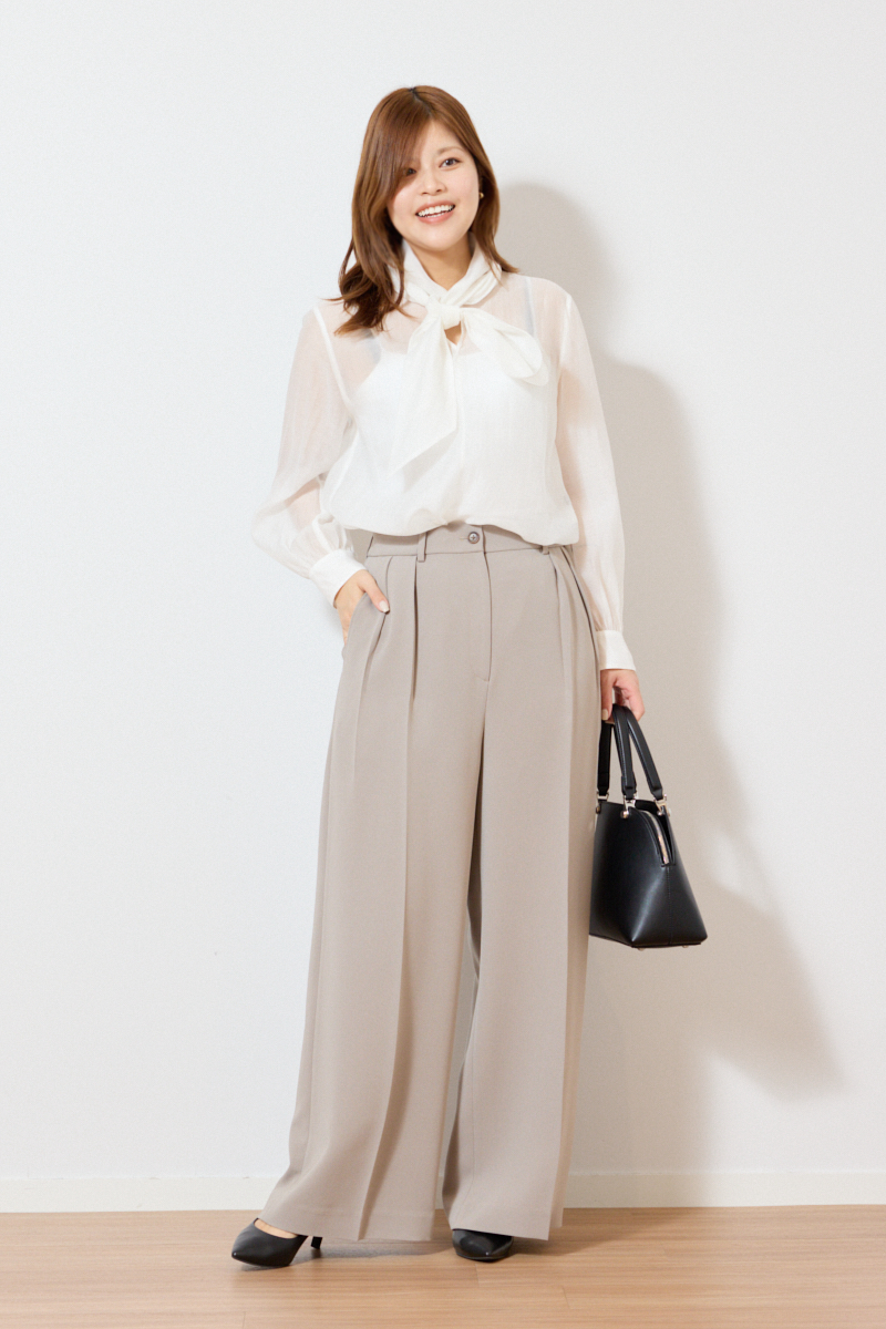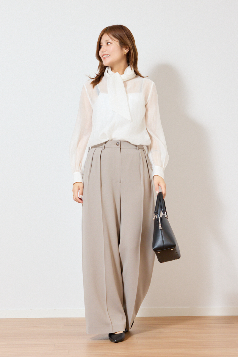 シアーボウタイブラウス¥8,990トリアセブレンド2タックワイドパンツ¥15,000(ともにプラステ)その他ライター私物