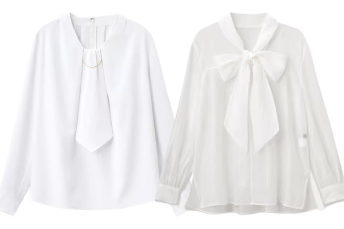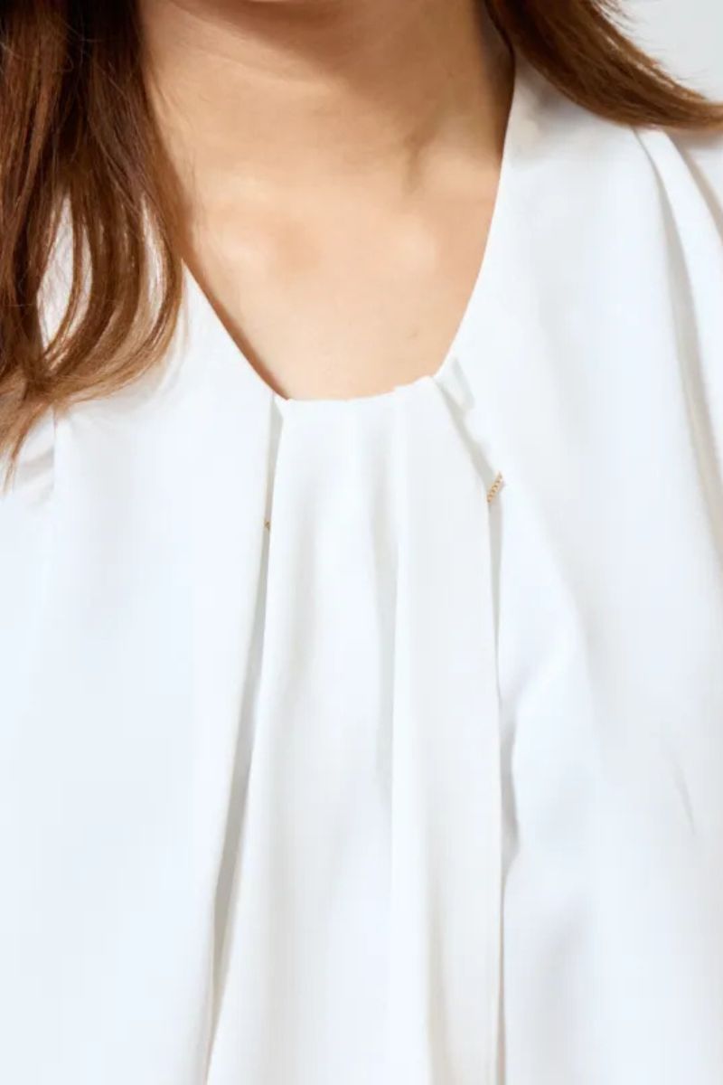 UVカット&吸汗速乾の快適な生地は、洗濯機OKでシワになりにくい優秀さ。ほどよく厚みがあり、防透性のある白なので、インナー選びに悩まないのもうれしいポイントです。ネクタイ風のボウタイに重なるチェーンパーツは、さりげなくも確かな華やかさをプラス。取り外し可能なので、シンプルなボウタイデザインとの2WAYで楽しめます。