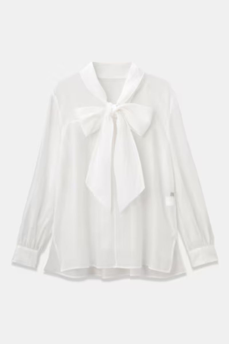 ふんわりと広がるAラインシルエットのボウタイブラウスは、トレンドのシアーな生地を使用。ぽわんとしたボリューム袖もコーデのポイントに。長めに設計されたボウタイは、シアーな生地ならではのしなやかさでアレンジ自在。ハンサムカジュアルに仕上げたい日は、片結びでラフに垂らすのがおすすめです。