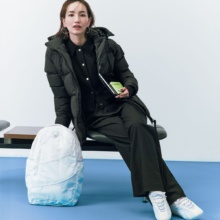 パンツ¥6,990(リーボック)ベストつきジャコット(2月発売予定)¥103,400(エンフォルド)中に着たタートルニットトップス¥14,300(ブロッサム)サングラス¥24,420(レイバン/ルックスオティカジャパン カスタマーサービス)フードつきストール¥4,400(ネノム/ジーンズ ファクトリー 卸団地本店)時計¥17,600(クルース)ショルダーバッグ¥17,600(アドカラム/アンソロジー)肩に掛けたナップサック¥13,200ソックス¥3,850(ともにSEA/エスストア)スニーカー¥19,800(ニューバランス/ニューバランスジャパンお客様相談室)