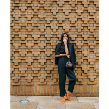 パンツ¥36,300(サードマガジン)ジャケット¥19,800(ユニバーサル オーバーオール×ジーンズ ファクトリー/ジーンズ ファクトリー 卸団地本店)ニットトップス¥37,400(ソブ/フィルム)キャップ¥4,620(ニューエラ)バッグ¥11,900(マンゴ)スニーカー¥13,200(リーボック)