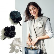 コサージュ各¥27,500ジャケット¥60,500パンツ¥49,500(すべてSANTÉ BY ETRÉTOKYO/エトレトウキョウ)バッグ「ブリヨン テンポ S」¥828,300(デルヴォー)ピアス¥64,900(トムウッド/トムウッド 青山店)
