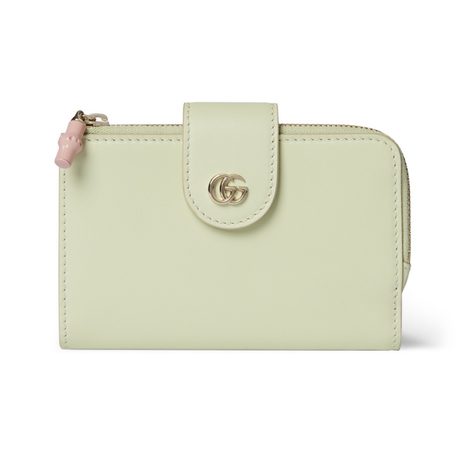 日本限定で登場した淡いミントグリーンのウォレットは、内側に桜を思わせるピンクを配したデザイン。バンブー モチーフのファスナートップも、キャッチーなアクセントになっています。カードを8枚収納可能なうえ、コインケースは大きく開くL字ジップタイプで取り出しやすさも◎。現金もしっかり持ち歩く人におすすめな、収納力のあるミニウォレットです。