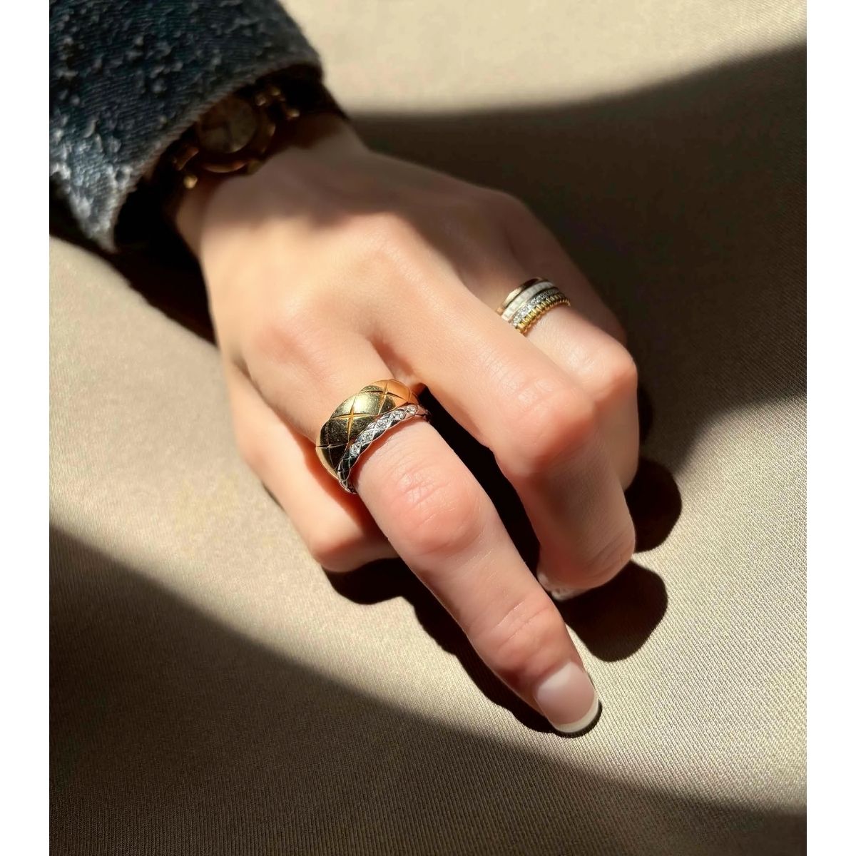 「長くウィッシュリストの筆頭にあったココ クラッシュは、長男の入園と次男の出産が重なり今だ! と思い切って2本購入。産後にシルバーリングを愛用するなか、地金ジュエリーの魅力を再認識したことと、年齢を重ねても愛せるタイムレスな名品であることも決め手になりました。最初はダイヤ付き1本の予定でしたが、単品・重ね付けと楽しめる2本遣いが今の自分のライフスタイルにフィット。稼働率が高く、買って正解でした」越後星奈さん/育休中(2歳と1歳の男の子ママ)