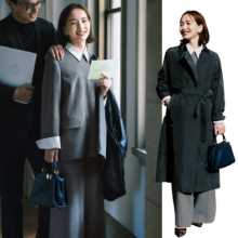 高身長ゆえ、セレモニーのコーデは色選びが重要。ブラックだと迫力が出すぎるため、優しい雰囲気をカラーに託して、クリームトーンをセレクトしました。全身Theoryなのですが、淡い色でもどこかハンサムで華美にならない、バランスの良さが魅力です。