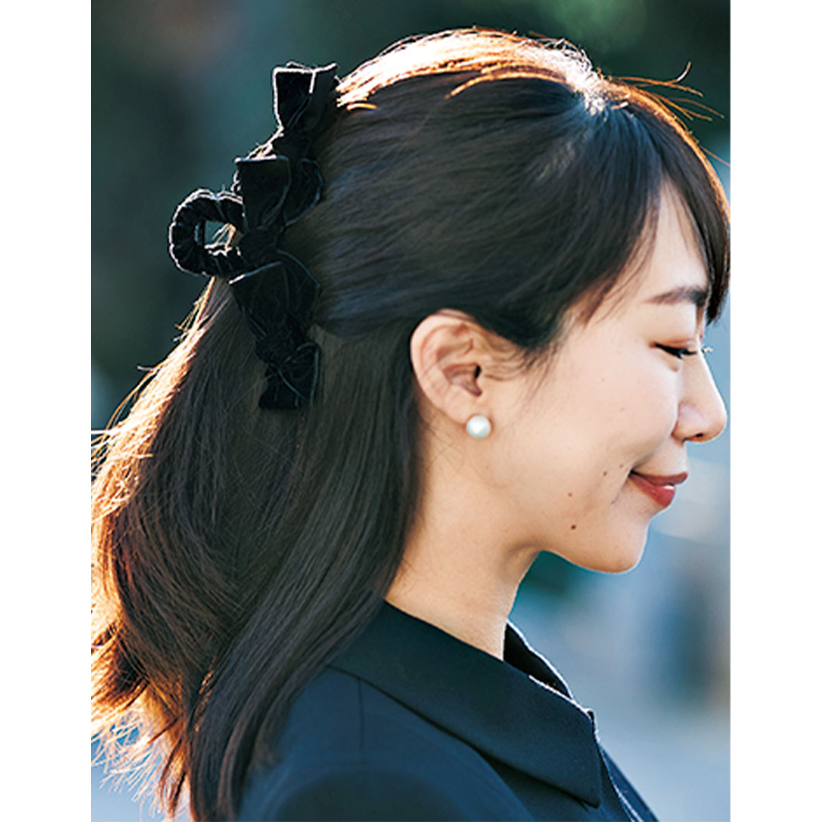 TRESSEのヘアクリップは、後ろ姿まで印象的に(島田さん)。太めを選んで大人っぽく(中本さん)。