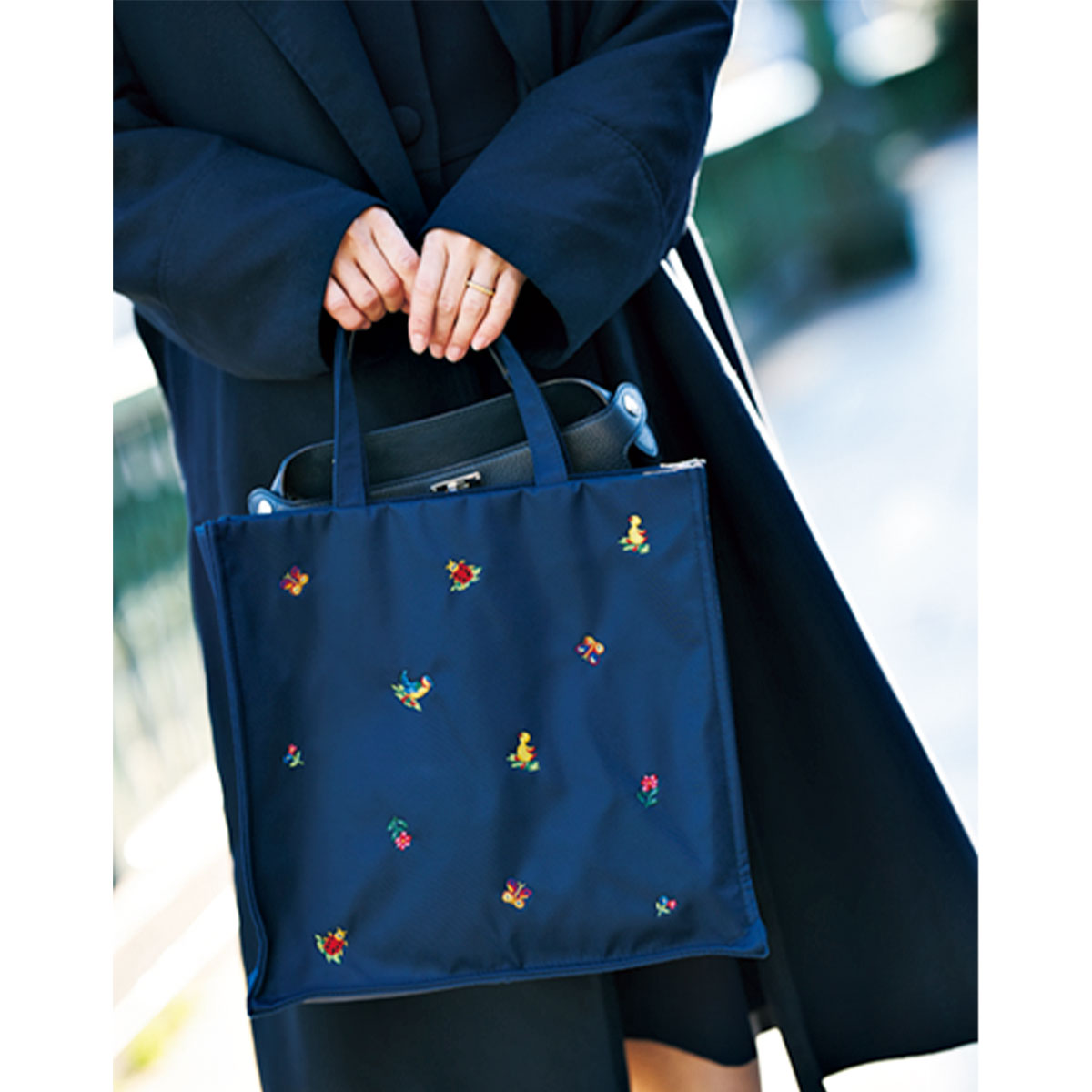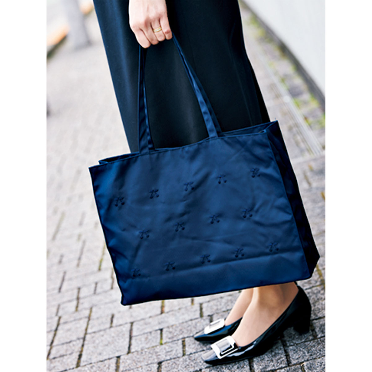 VERYコラボの“学校フェイラー”は、控えめなコーデをほどよく盛り上げてくれます(吉田友里さん)。チェリーが並ぶ刺繡は子どもが持っても可愛いので一緒に愛用中(石垣夏美さん)。