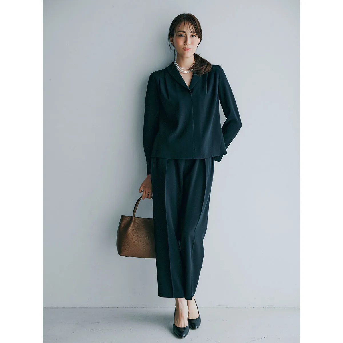 ブラウス¥15,400(アニュアンス)パンツ¥15,400(ともにアニュアンス)バッグ¥22,000ネックレス¥3,850(ともにVS セレクション)パンプス¥19,250(ダイアナ/ダイアナ 銀座本店)