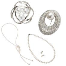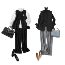 ブラウス¥18,700パンツ¥14,300(ともにアレグレ)ネックレス&ピアス[セット販売]¥3,850ブローチ¥7,700バッグ¥22,000(すべてVS セレクション)パンプス¥33,000(銀座かねまつ/銀座かねまつ6丁目本店)