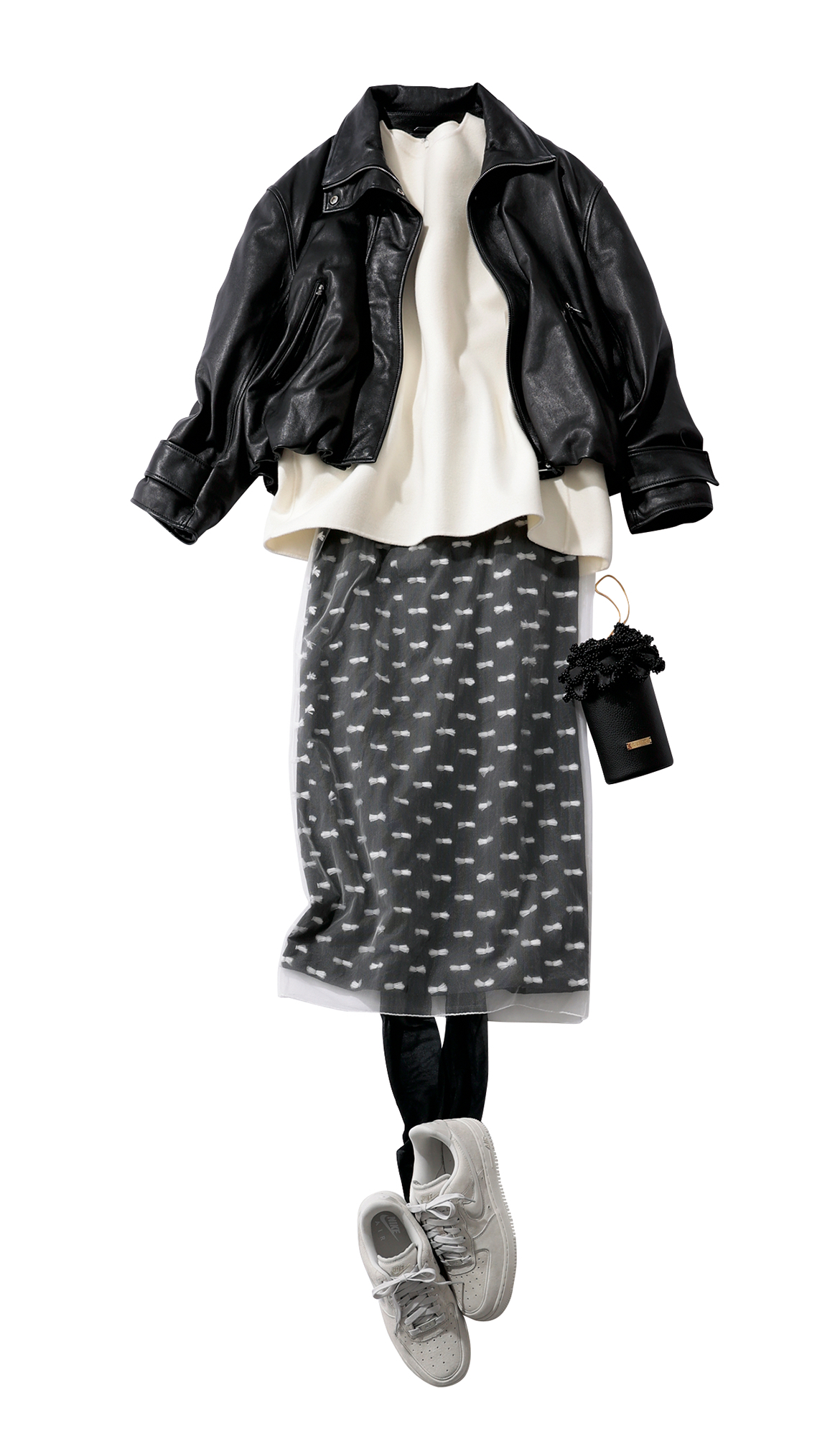 ジャカードやチュールなど可愛げのある生地スカートとも好相性。レザージャケットがあれば足元がスニーカーでもなじんで新鮮。子連れのお出かけにもおすすめ。レザージャケットはプランクプロジェクト、プルオーバーはHER.、スカートはシーニュ、バッグはヴァニーナ、スニーカーはナイキ スポーツウェアのもの。