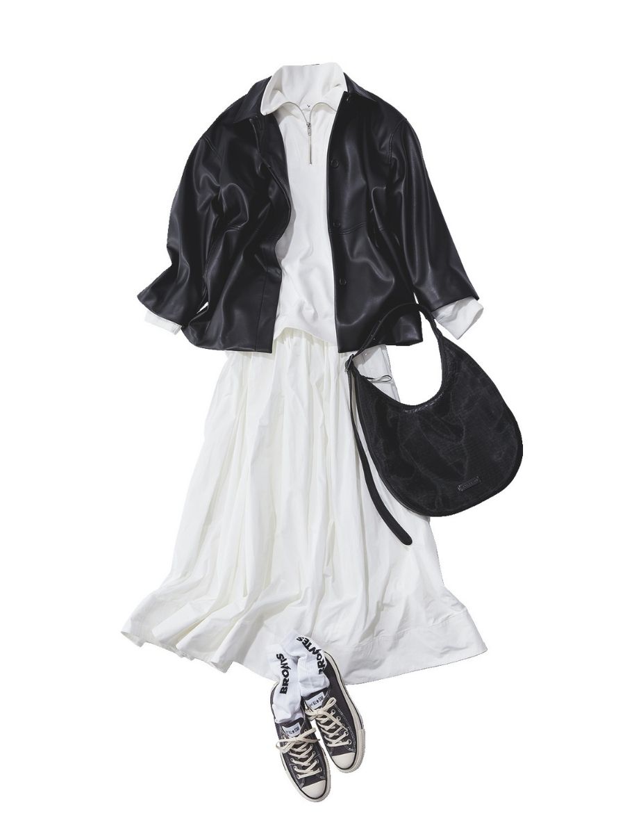 春真っ盛りな日には白の配分をとびきり多くして、ふんわりスカートを合わせれば黒のレザージャケットも軽快に。レザージャケットはユナイテッドアローズ、プルオーバースウェットはイレ―ヴ、スカートはジャーナルスタンダード、バッグはチャールズ&キース、スニーカーはコンバース フォー RHCのもの。