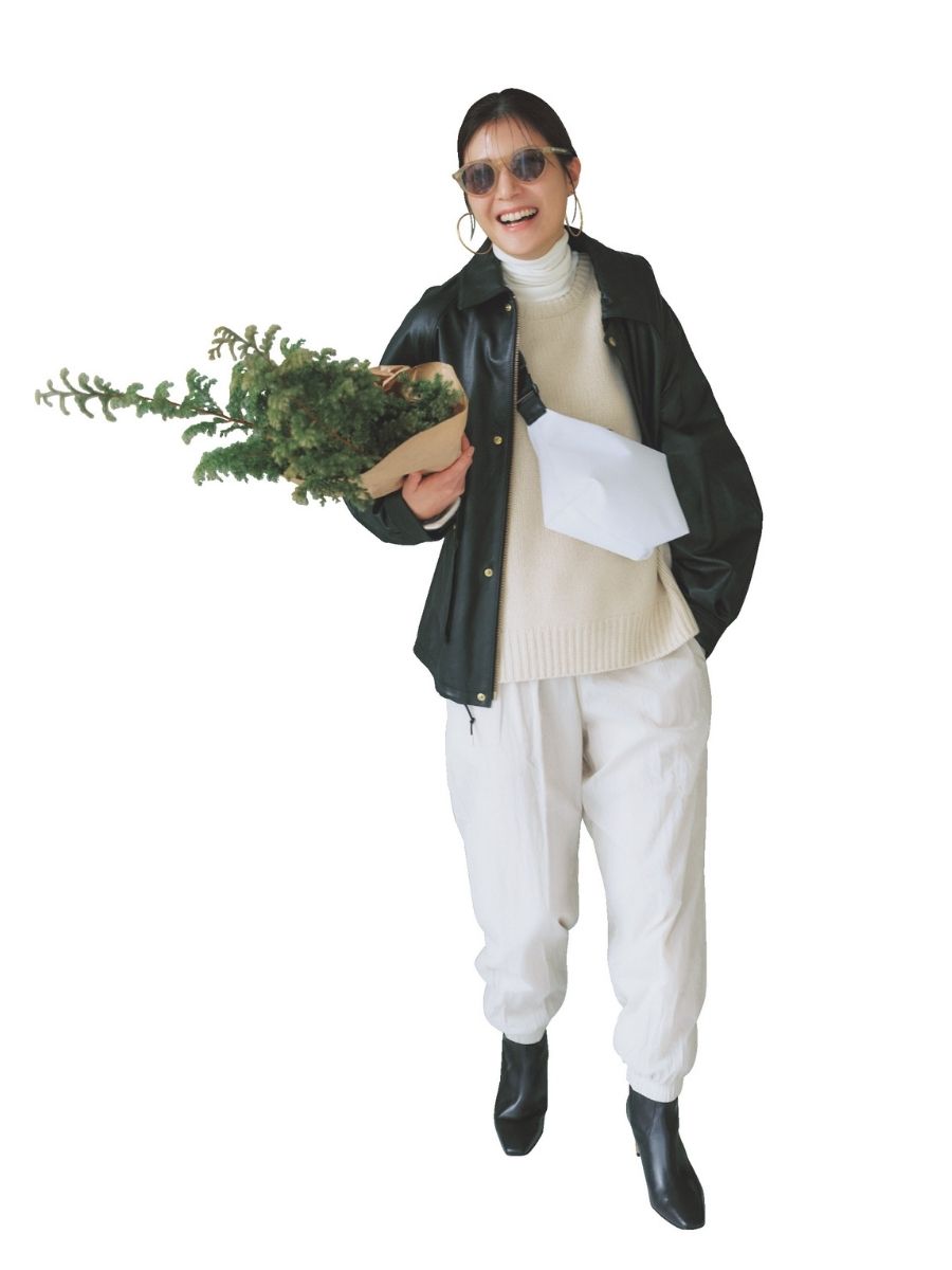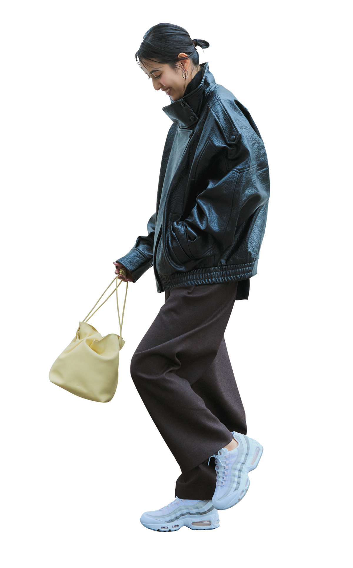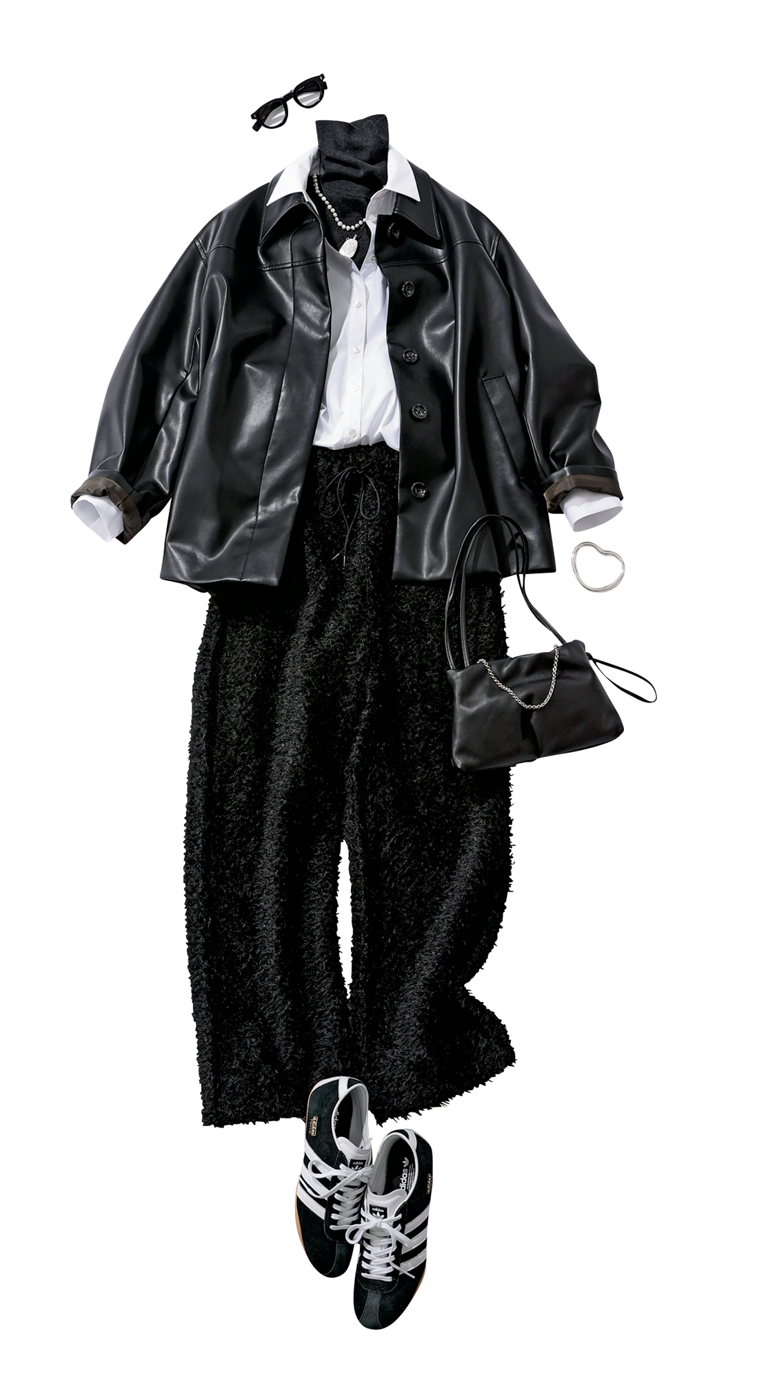ゆるパンツにスニーカーのカジュアルコーデも、レザーのリッチさがあればオン仕様に。大きめサイズのレザージャケットが断然今年顔。明るめ小物で春ムードを演出して。レザージャケットはザラ、タートルニットはカオス、パンツはブロッサム、スニーカーはナイキ スポーツウェア、バッグはヴァジックのもの。