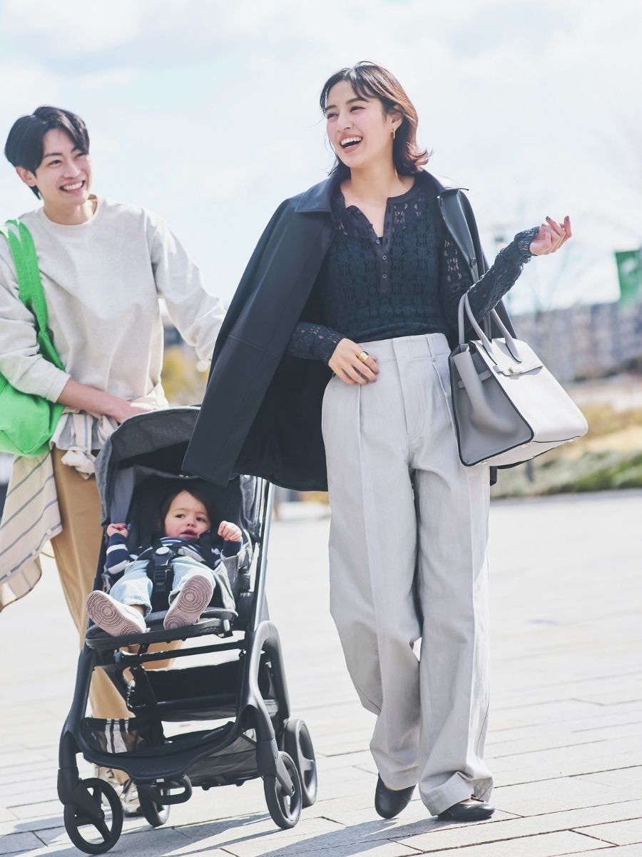 ママ友ランチやショッピングなどオシャレしたい日にもぴったりなレザージャケット。レザーの艶が、モノトーンコーデを華やかに仕上げてくれます。スニーカーとの相性が良いのも、たくさん歩く買い物DAYにうれしい。ジャケットはCITEN、シャツはアナイ、ニットはウィム ガゼット、パンツはザ ポーズ、スニーカーはアディダス、バッグはラシットのもの。