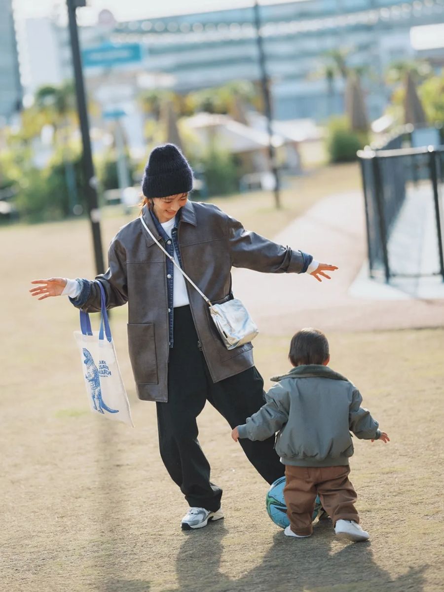 ジャケットの下にデニムジャケットをインして、ヴィンテージ感のあるカジュアルに。フェイクレザーは汚れてもさっと拭けばいいので、子連れのお出かけに心強い! オシャレな公園服としても使えそうです。レザー調ブルゾンはエミ、Gジャンはトラディショナル ウェザーウェア、Tシャツはエイトン、パンツはHER.、ニット帽はサクラ、バッグはテッセンクリエーション、トートバッグはオブラダ、スニーカーはニューバランスのもの。