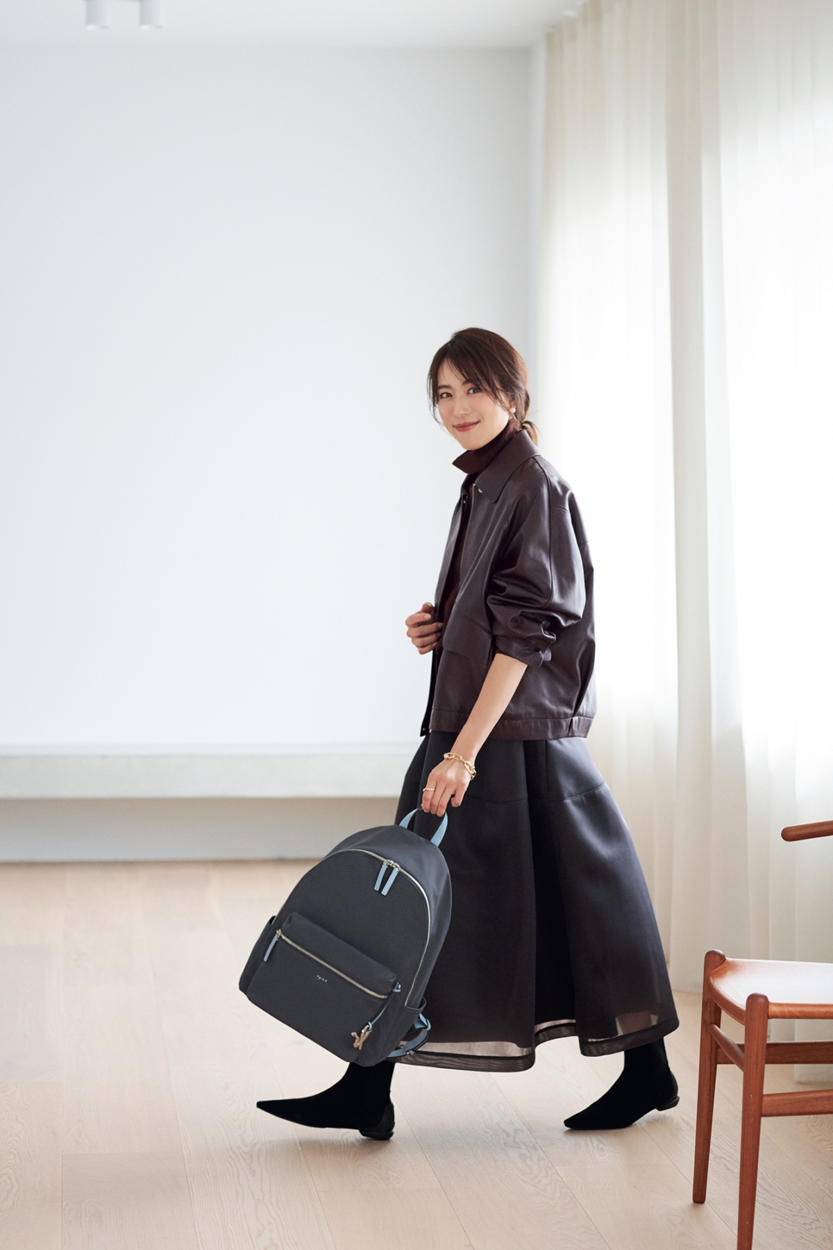 黒のフレアスカートに、ブウランのレザーを合わせて春らしい軽やかなバランスに。上下の素材の違いも、お互いの魅力を引き立ててくれます。足元はブーツやパンプスでスッキリさせるのがおすすめ。ジャケットはハウス オブ ロータス、タートルニットはイレーヴ、スカートはエミ、リュックはアニエスべー、靴はシーセイのもの。