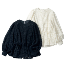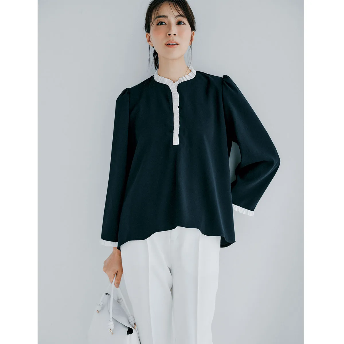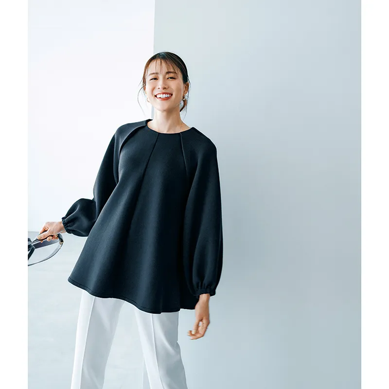 広がるシルエットのブラウスは