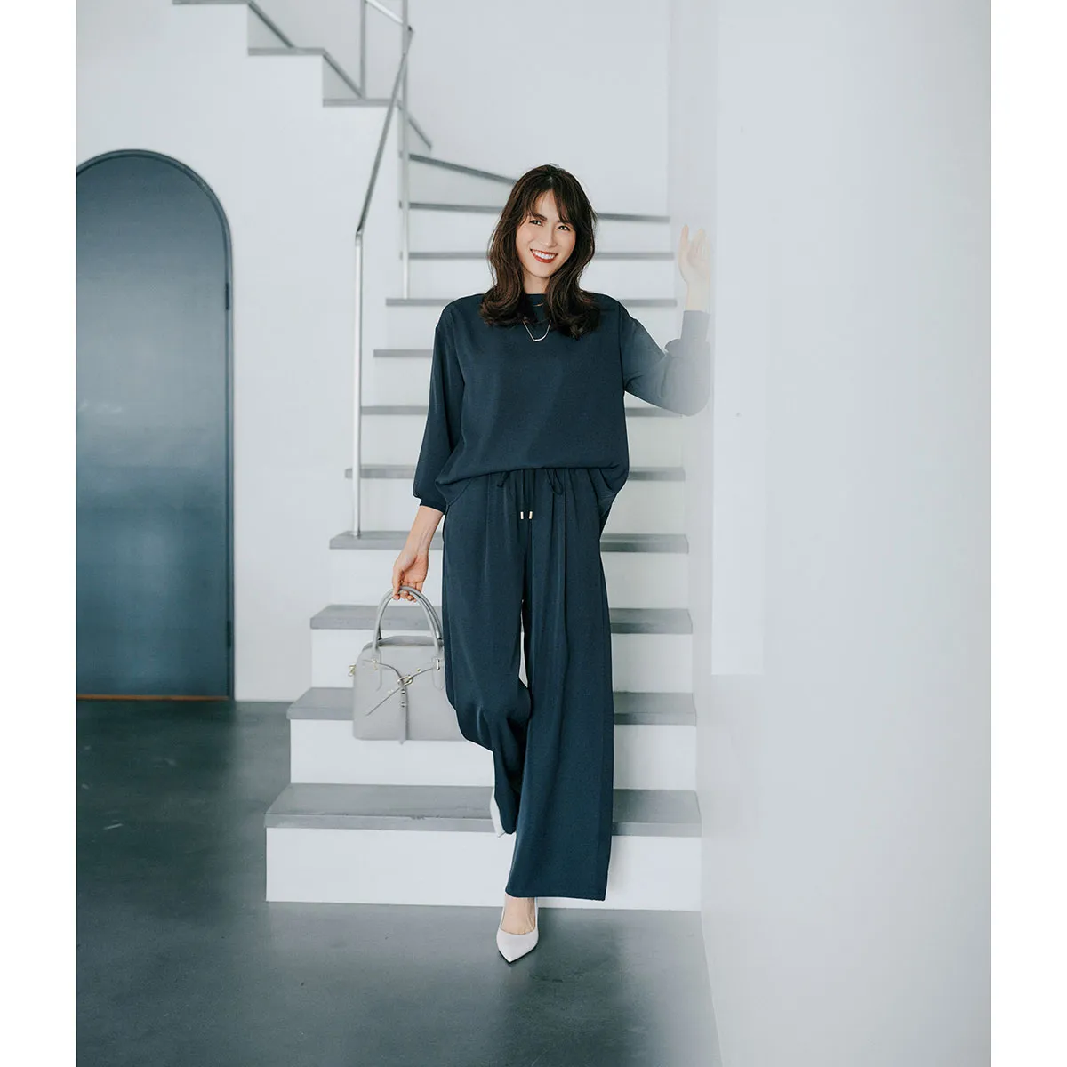 ブラウス¥9,900パンツ¥12,100(ともにエマテイラー/STYLEDOOR)バッグ¥13,750(アルテミス by ダイアナ/アルテミス by ダイアナ アーバンドック ららぽーと豊洲店)パンプス¥8,900(チャールズ&キース/チャールズ&キース ジャパン)ネックレス¥9,900(アビステ)
