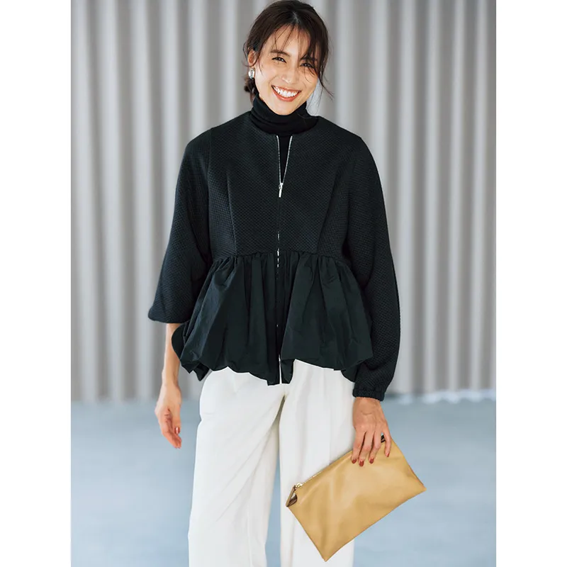 ブルゾン¥20,900(スリースクエア)ニット¥25,300(スローン╱ザ ショップ スローン 新静岡セノバ店)パンツ¥36,300(タンジェント╱ザ エディット ストア)イヤリング¥15,400(アビステ)バッグ¥39,600(オルセット╱オルサ)シューズ¥36,300(TOKYO WEEKLY JOURNAL╱バッロクジャパンリミテッド)