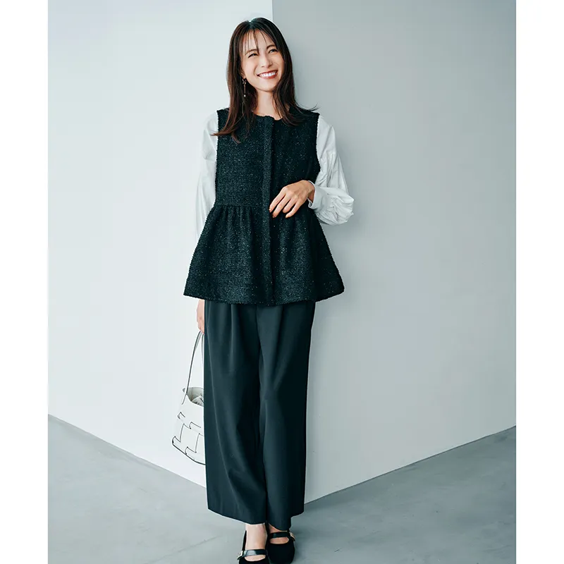 ジレ¥21,450(エルド)ブラウス¥25,300(ツル バイ マリコ オイカワ)パンツ¥9,990(アンフィーロ)バッグ¥53,900(オルセット/オルサ)パンプス¥9,900(チャールズ&キース/チャールズ&キース ジャパン)ピアス¥6,380(アビステ)