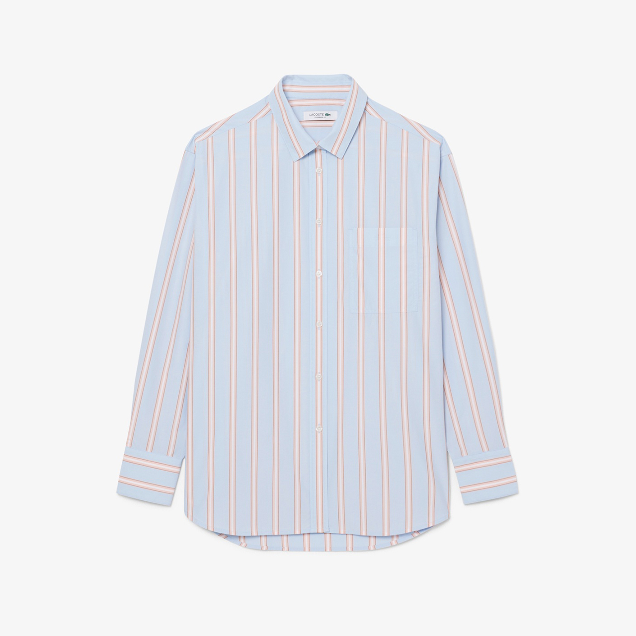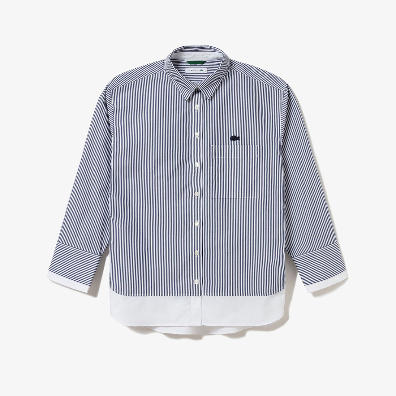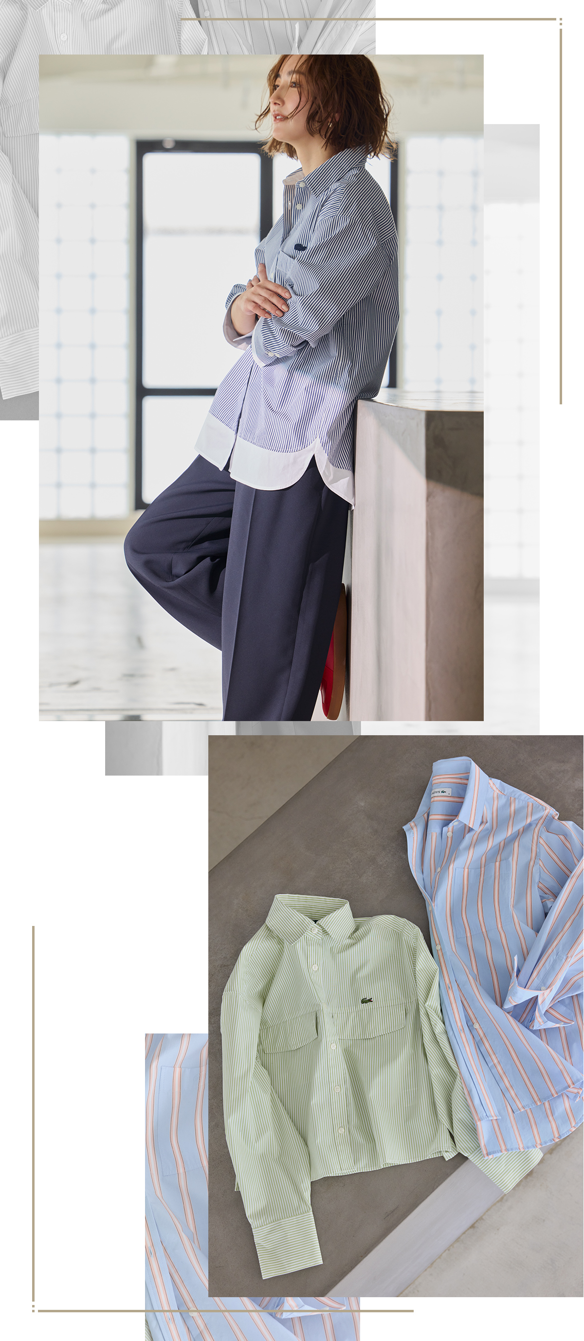 裾の切り替えがポイントだから、あえてアウトして着たい一枚。春のアウター感覚でもシャツを取り入れてみて! レイヤード風ストライプシャツ¥18,700タックパンツ¥29,700スニーカー¥15,950(すべてLACOSTE/ラコステお客様センター)その他/スタイリスト私物(右物)他にも爽やかなカラーのストライプシャツが豊富。ワイドパンツにも合わせやすいショート丈も♡ ショートグリーンシャツ¥18,700ブルー×ピンクシャツ¥22,000[※5月発売予定](ともにLACOSTE/ラコステお客様センター)