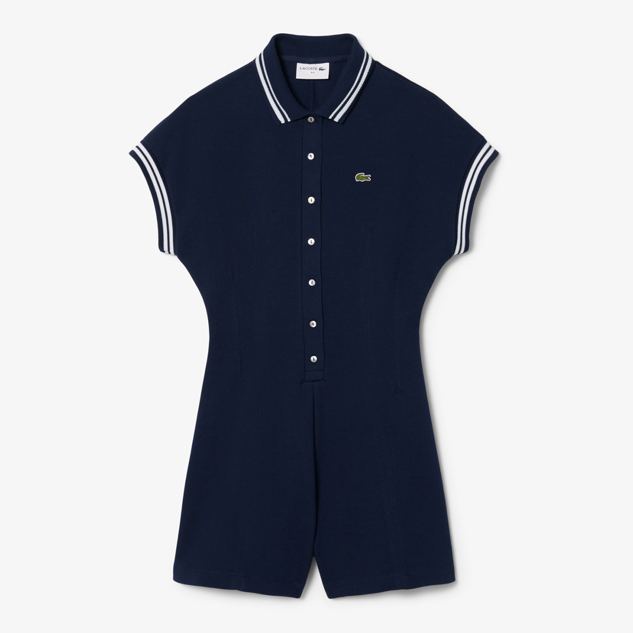 定番のポロタイプこそ新しいデザインに注目したい! 白いトリミングがあるオールインワンや、プリーツタイプのワンピースなら、スポーティ要素も満載なのに、きれいなママでいられる! 第一ボタンまで留めて着こなしたい。