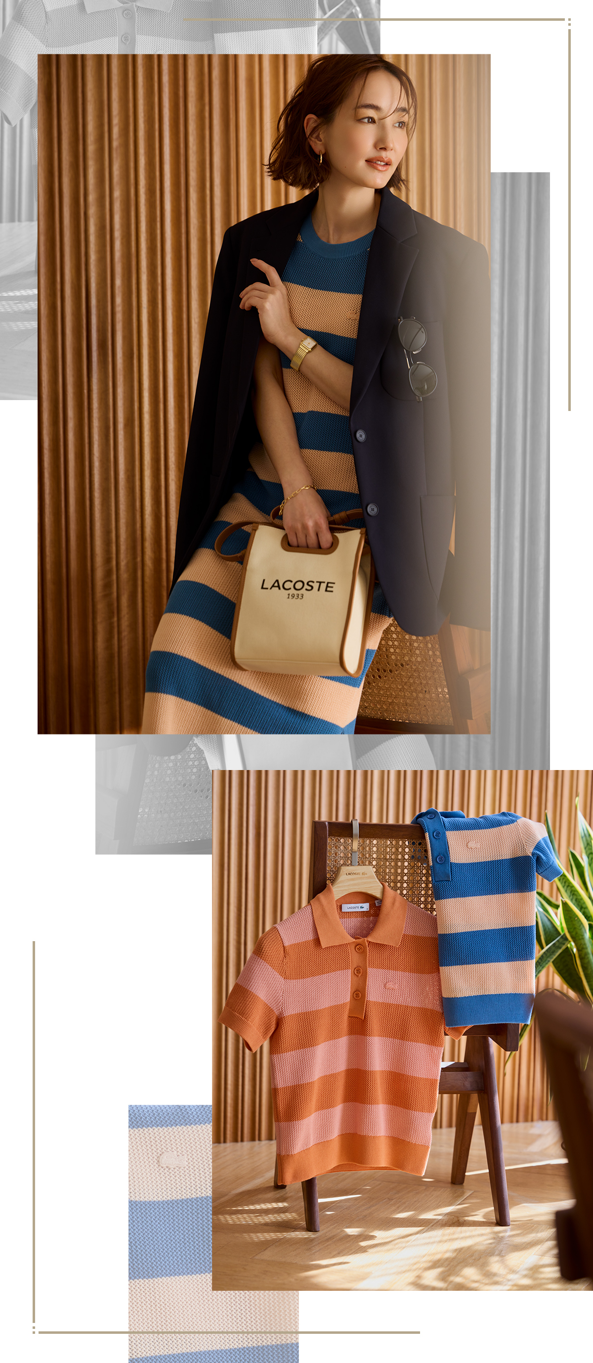 単色のカラーアイテムよりも、ボーダーで色を取り入れるのって実は簡単。コーディネートで安心のネイビージャケットを合わせることで安心してトライできる!ボーダーニットワンピース¥25,300[※5月発売予定]ジャケット¥57,200[※4月発売予定]バッグ¥20,900サングラス[※参考商品]時計¥35,200(すべてLACOSTE/ラコステお客様センター)その他/すべてスタイリスト私物(静物)ボーダーポロニット各¥22,000[※5月発売予定](ともにLACOSTE/ラコステお客様センター)