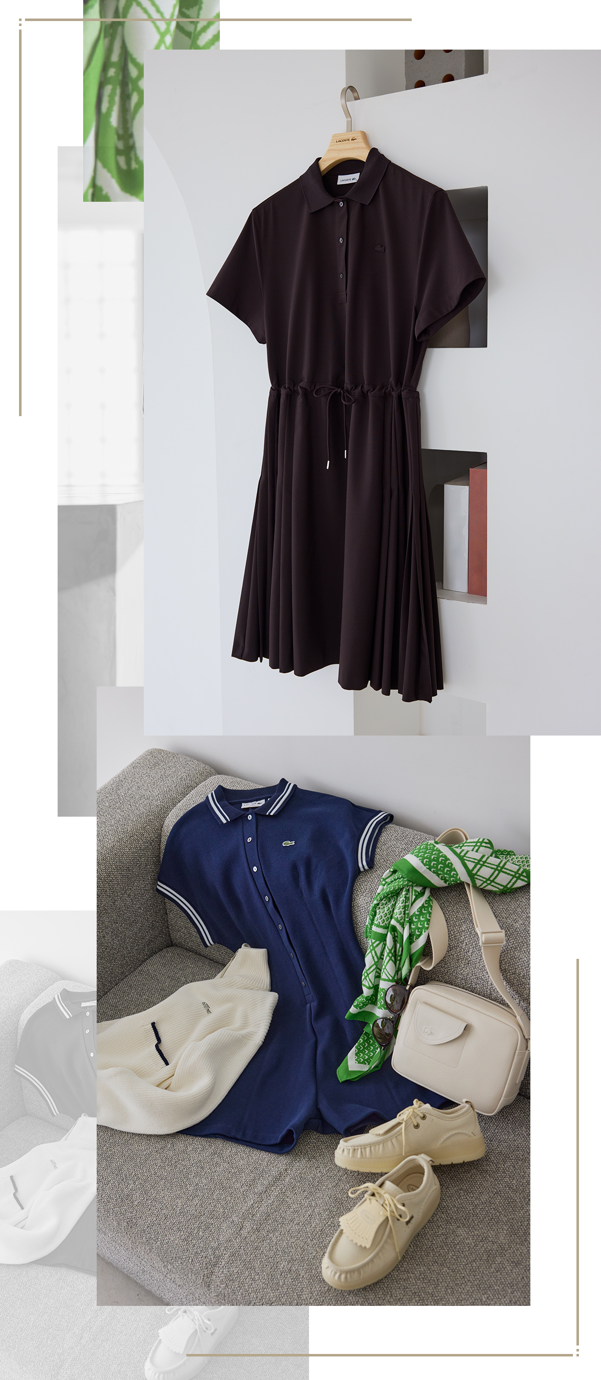 着慣れないと選びのコツが難しいのがカジュアルアイテム。ポロシャツベースのデザインなら、衿がついているからスカートやオールインワンでキレイめにまとまりつつ、TPOにあった雰囲気になれるのが便利です。 [上]ポロワンピース¥38,500[下]オールインワン¥23,100ジップニット¥26,400バッグ¥27,500スニーカー¥20,350サングラス¥28,600スカーフ¥11,000(すべてLACOSTE/ラコステお客様センター)