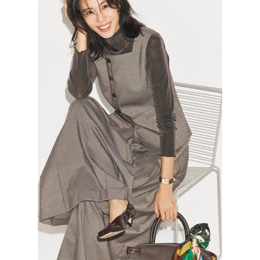 ジレ¥19,800パンツ¥24,200(ともにアルページュストーリー/アルページュストーリー プレスルーム)カットソー¥20,900(アナイ)バッグ¥101,200(ジャンニ キアリーニ/ジャンニ キアリーニ 銀座店)パンプス¥37,400(ピッピシック/ベイジュ)スカーフ¥22,000(マニプリ)ピアス¥7,480(ピルグリム/ZUTTOHOLIC)時計¥36,300(リップ/エイチエムエスウォッチストア 表参道)