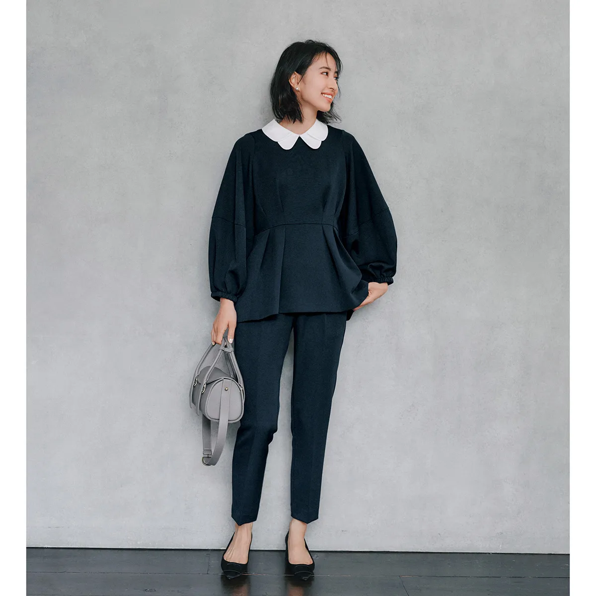 ブラウス¥15,400(アニュアンス)パンツ¥15,400(ともにアニュアンス)バッグ¥22,000ネックレス¥3,850(ともにVS セレクション)パンプス¥19,250(ダイアナ/ダイアナ 銀座本店)