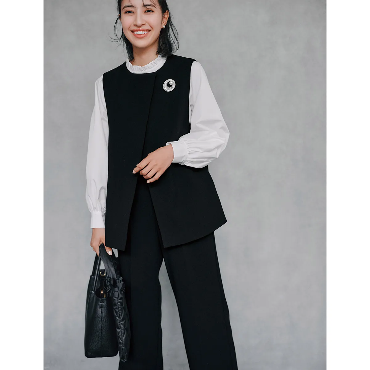 ジレ・ブラウス・パンツ[セット販売]¥33,000(ニッセン)キルティングバッグ¥8,250(スリースクエア)ブローチ¥7,700ピアス[単品販売]¥1,540バッグ¥22,000(すべてVS セレクション)