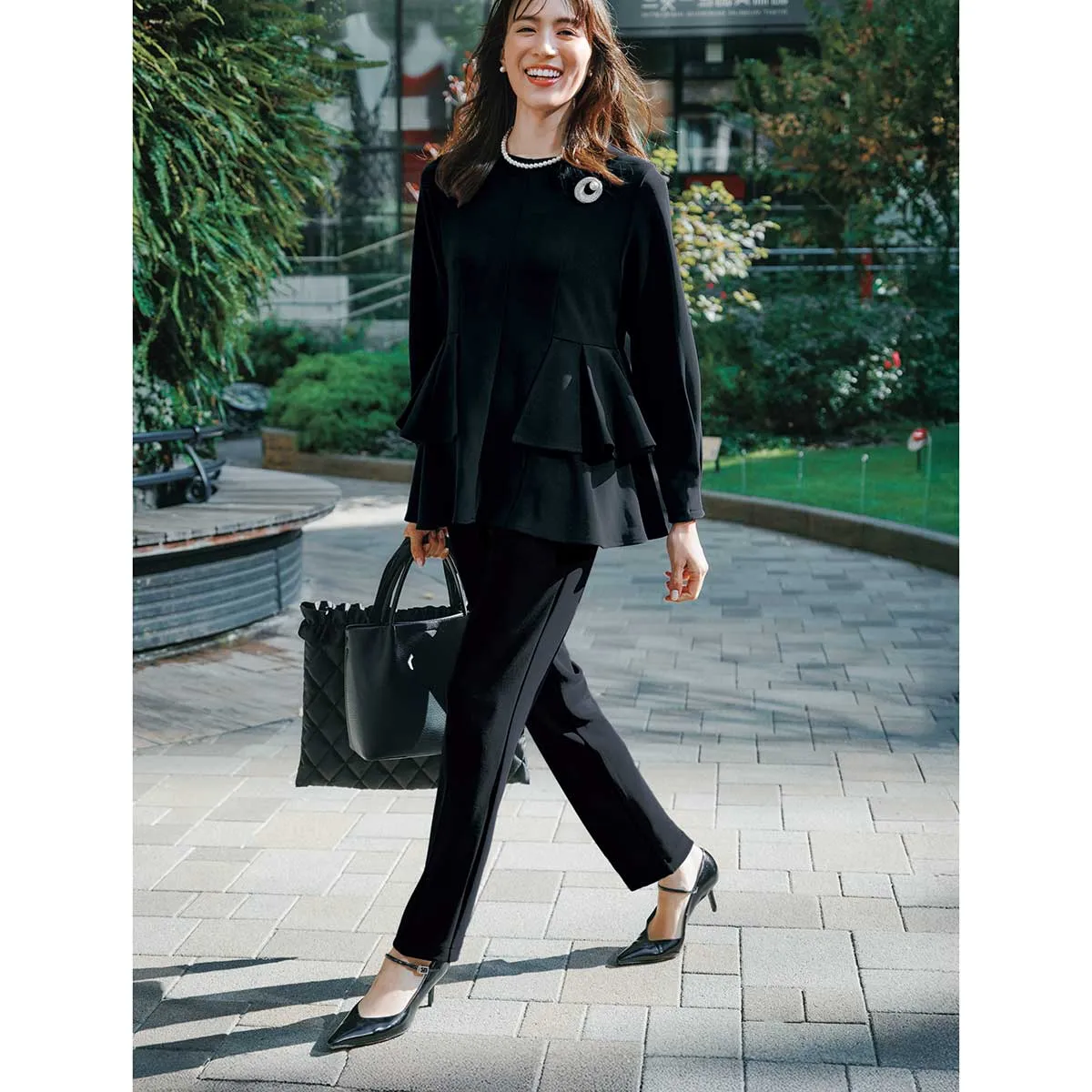 ブラウス¥19,800パンツ¥17,600(ともにスリースクエア)ネックレス&ピアス[セット販売]¥3,850ブローチ¥6,600(ともにVS セレクション)バッグ¥38,500(ルメメ)パンプス¥9,900(チャールズ&キース/チャールズ&キース ジャパン)