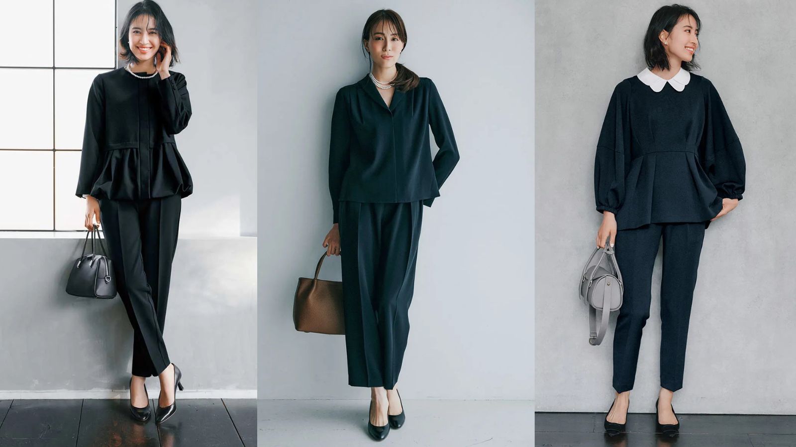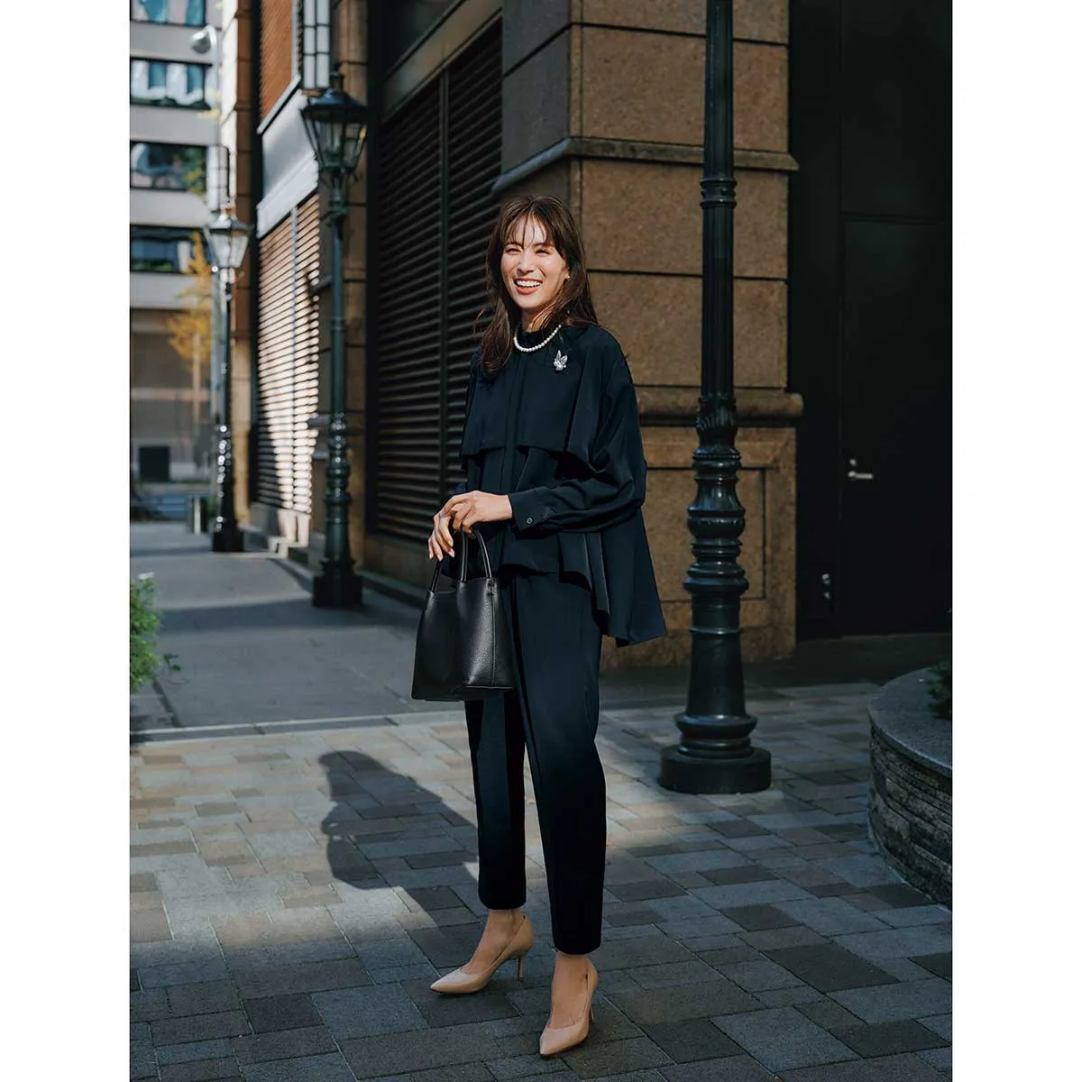 ブラウス ¥17,930〜¥19,030パンツ¥19,910〜¥21,010※サイズによって価格が異なる(ともに組曲)ブローチ¥7,700ネックレス&ピアス[セット販売]¥3,850(ともにVSセレクション)バッグ¥107,100(カフネ/カフネ カスタマーサポートセンター)パンプス¥28,600(ツル バイ マリコ オイカワ)