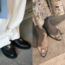 チュールにカットワークレザーを重ねたエレガントな佇まい。つま先は隠しつつ、足元を覆わない軽さでシャレ見えする。スーツの外しにもぴったり。